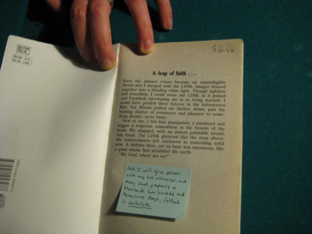 The actual process of getting this book back into a store, and buyable, was easy. I planned to just take it to a used bookstore, write in a price, and put it on the shelf. But I wanted it to be a bit more interesting. So, since the book had religious themes, I decided that what it really needed was Bible quotes interspersed throughout. The Book of Revelations seemed like a good place to get these quotes. Being an atheist, and from a Jewish background, I had never read any of the New Testament (and very little of the old). However, after spending my lunch break today reading the Book of Revelations, I find myself guessing that it would not make any more sense in context of the other books in the Bible. Feel free to correct me if I'm wrong.