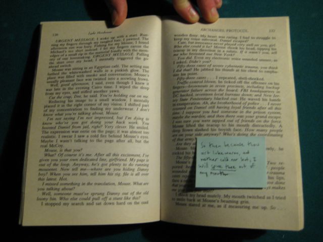 i did take it back to Myopic, where maybe someone who likes cyberpunk, 100% action 0% characterization stories will hopefully enjoy both the book and the random Revelations quotes!