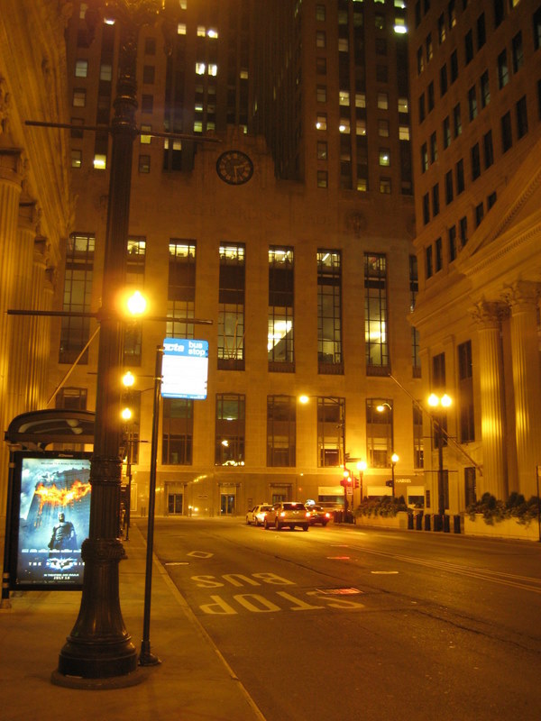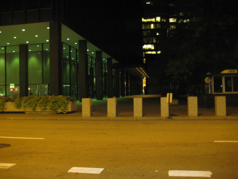 The huge halls of its financial institutions are empty (except for that one lonely night watchperson at the front desk, evenly spaced throughout with all the other night watchpeople - do they have some kind of network at least? Do they know each other or do they just sit at their desk alone all night?). The yellow glow of the streetlamps pervades everything, without the bright whiter glow of car headlights to cut it. The sidewalks, often deliberately constructed as part of the plazas of huge companies' headquarters, wide and landscaped, where millions of people push and shove on work days, are deserted.