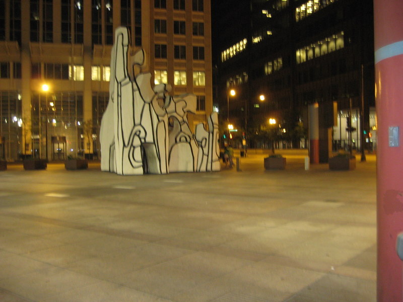 a sculpture in the State of IL plaza. you can see a few other people to the right of the sculpture.