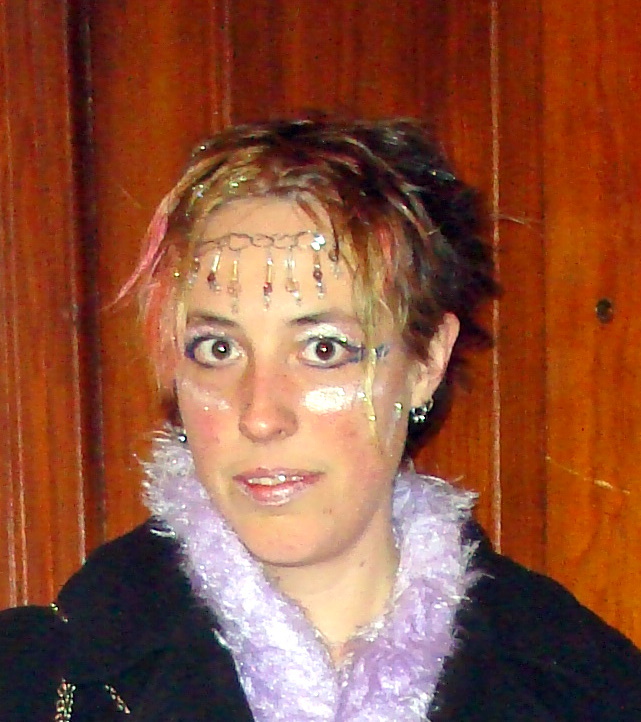 So I put on a frilly dress (much of which would unfortunately have to be covered by a jacket due to weather), bleached out a bunch of my hair, donned some ridiculous tights and shoes, adorned myself with a "headdress", and covered myself with sparkles.