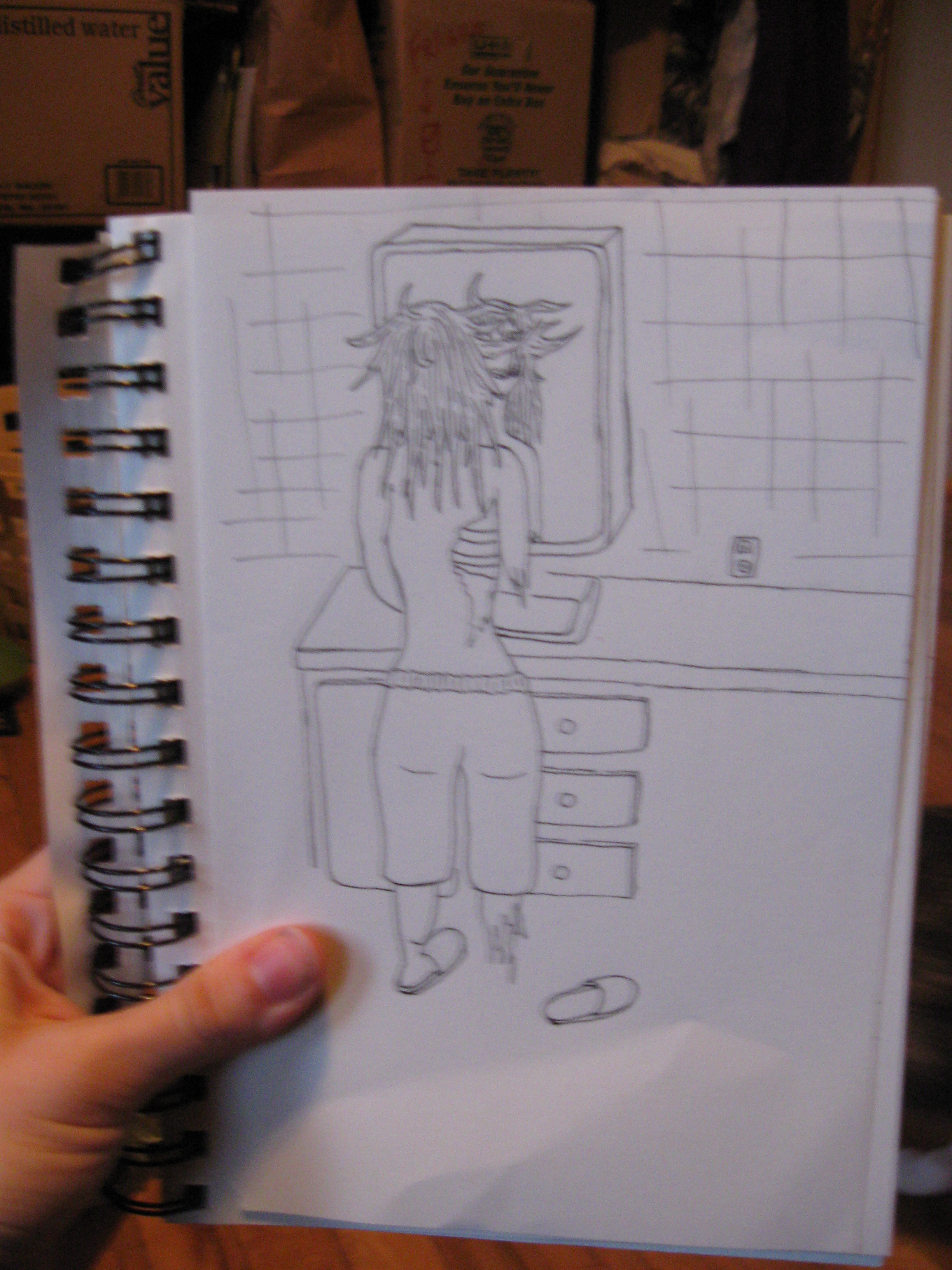 First I had an idea (there's no picture for that part). Then I drew a picture. It's a little hard to tell, but she's licking her eyeball.