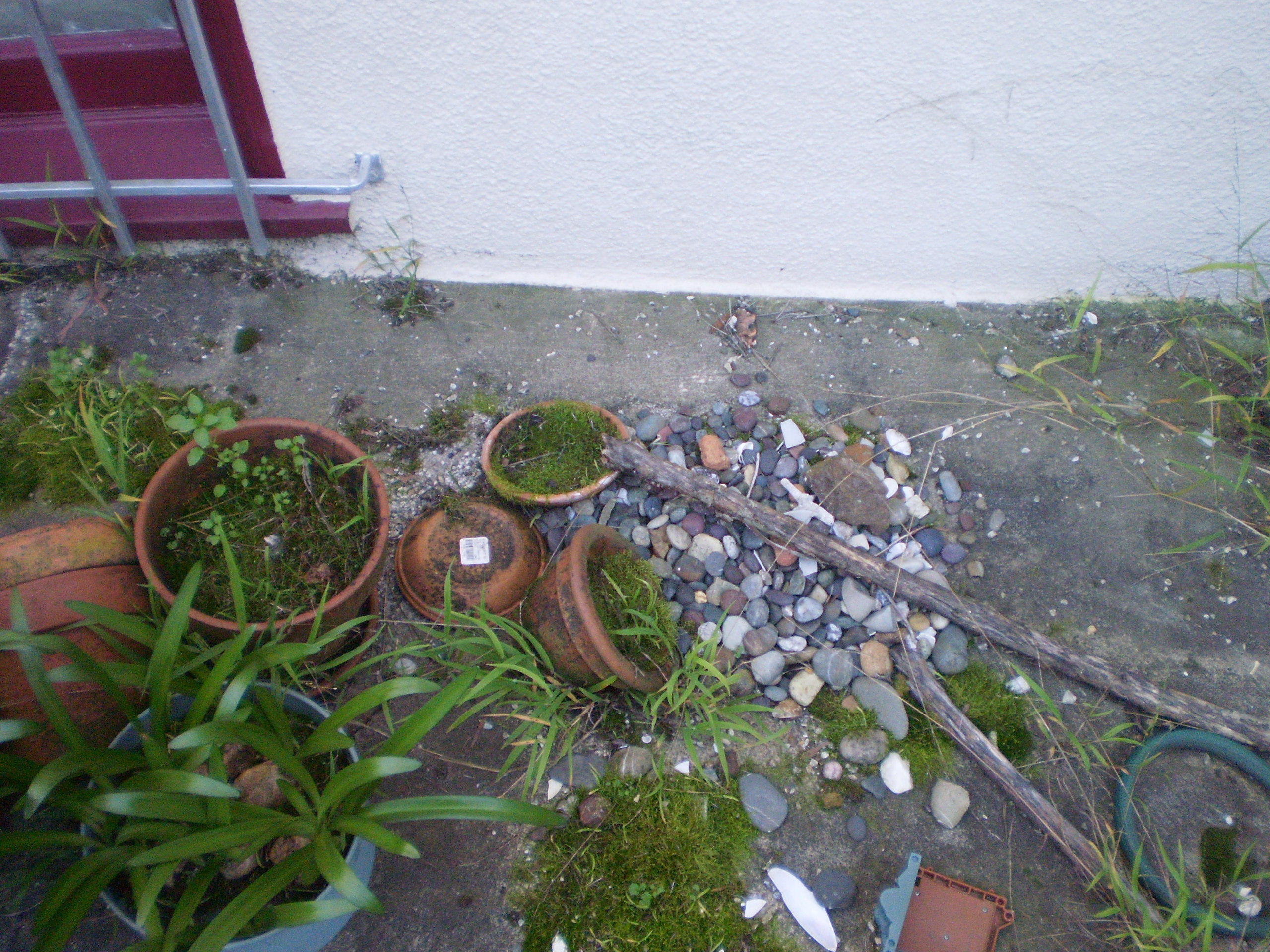The grim remains of stones and potted plants that attempted to escape. Two remain unbroken, but are mentally shattered and no longer move.
