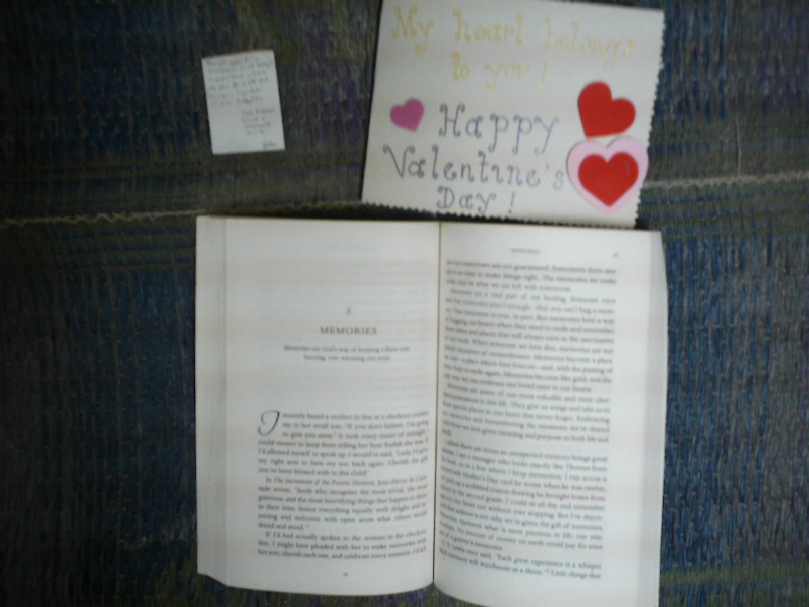 I took one of only two pictures I currently have with me and wrote a little note on the back of it. (I chose the picture of my ex-boyfriend, john, because the other picture was of me in boot camp and that was just too scary.) I found a valentine's day card on our Any Soldier table, stuck the picture inside it, and stuck both the card and the picture inside the book "Grieving Forward: Embracing Life Beyond Loss." I then placed the book back where I got it, on our free book shelf.
