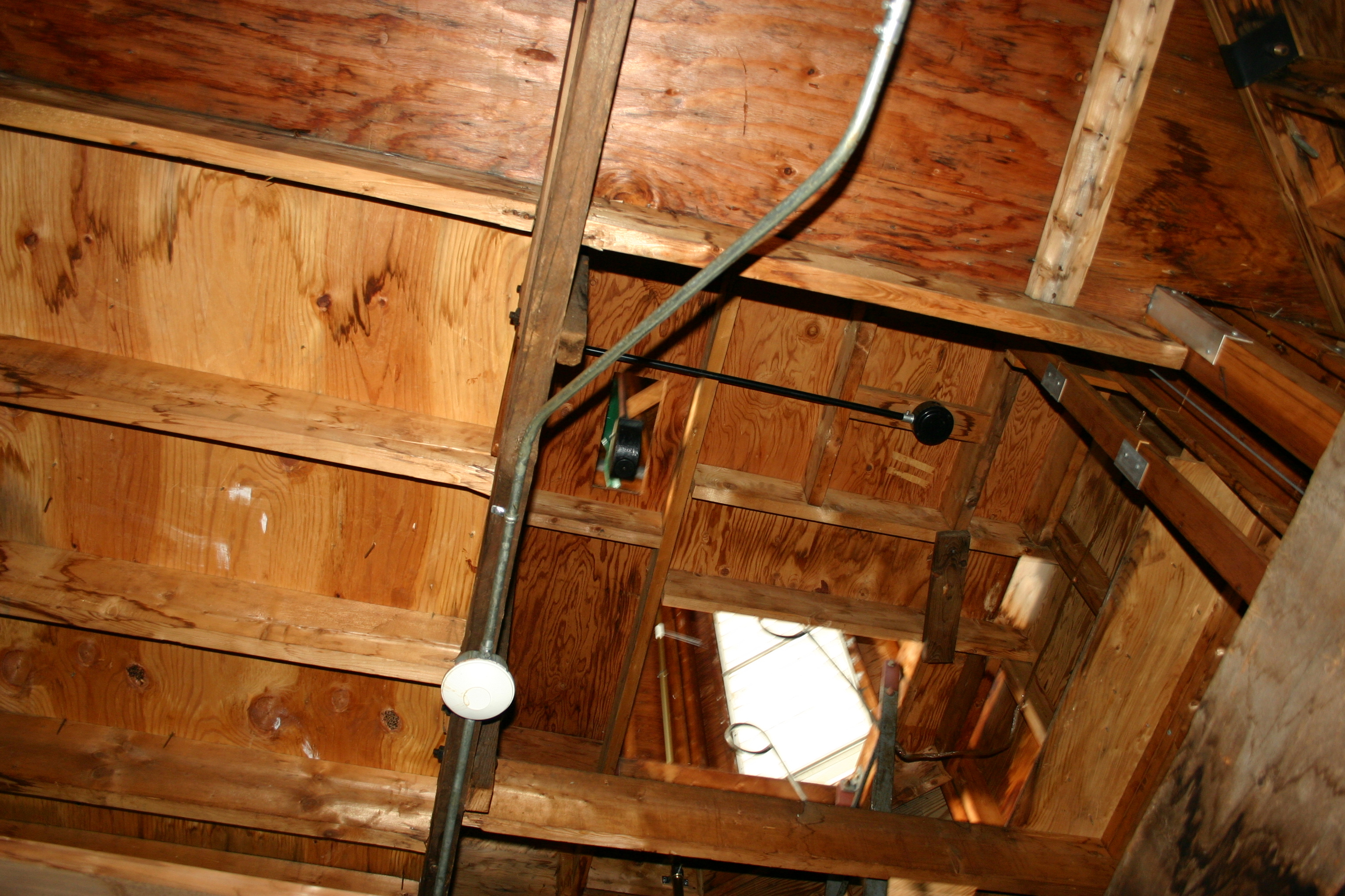 This is the bottom of the clock platform. The big white spot is where the ladder up is. The bottom of the pendulum and some of the weight system is visible.