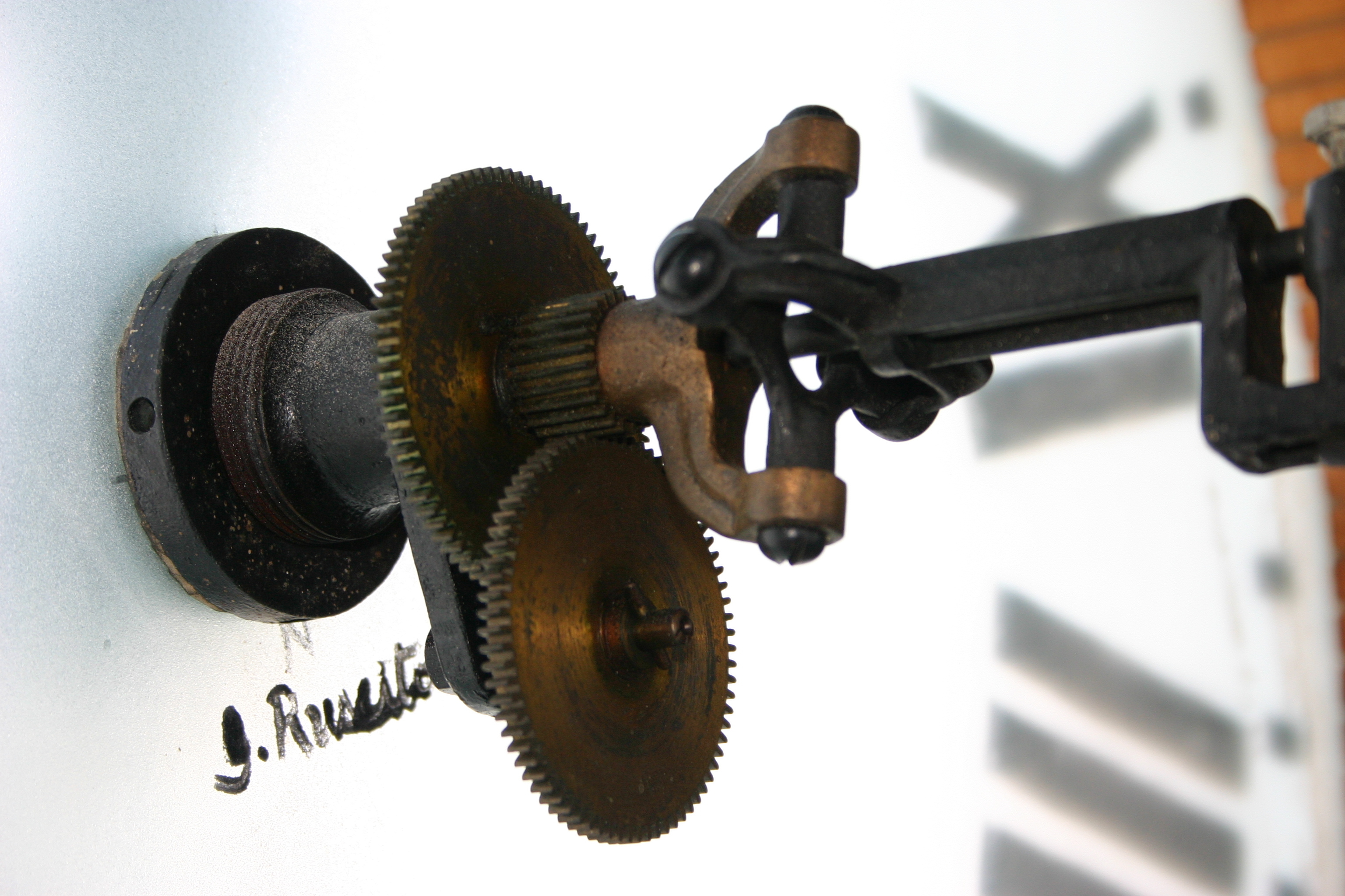 Some gears on the backside of the clock face. You can see one of the clock makers' signature.