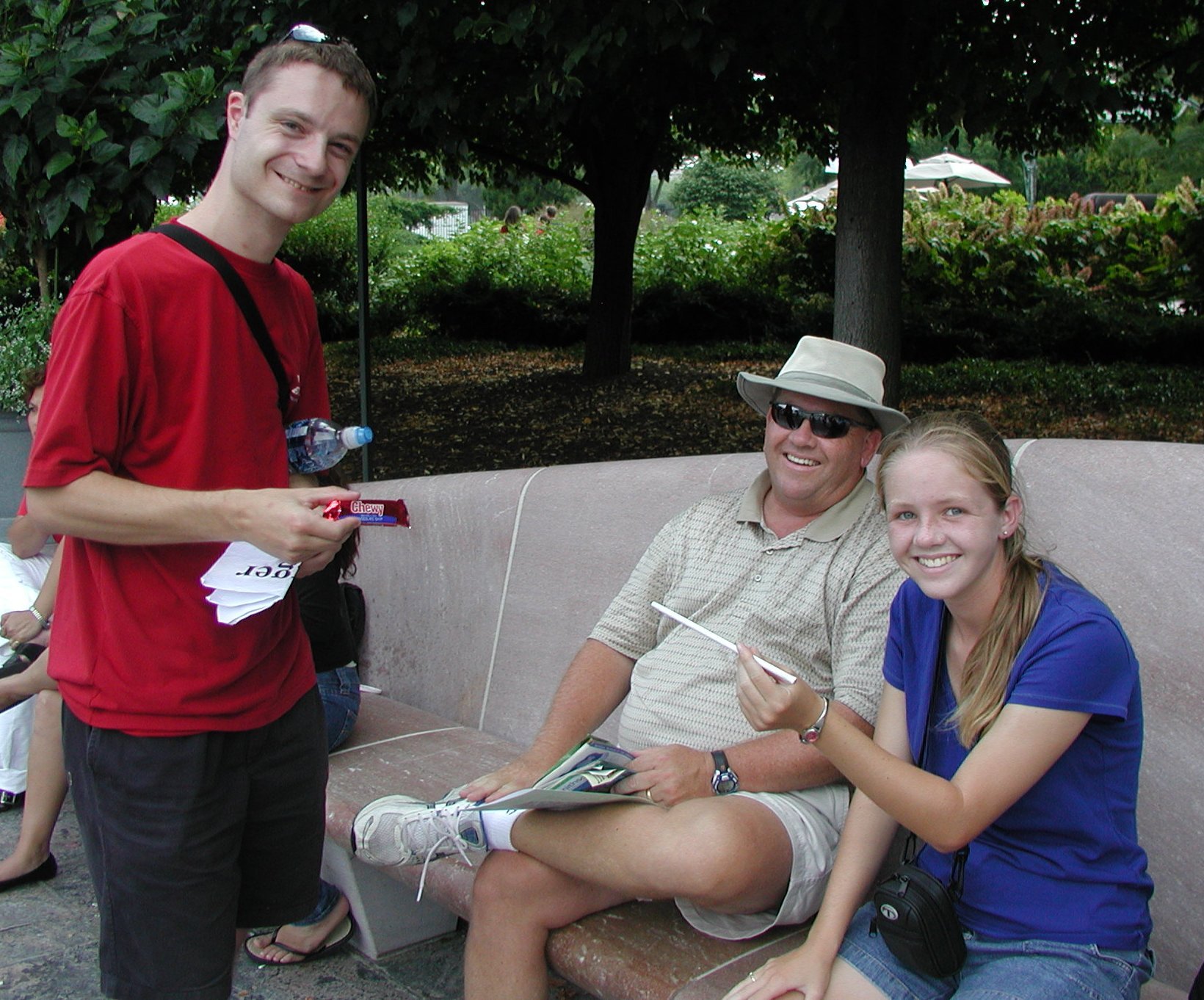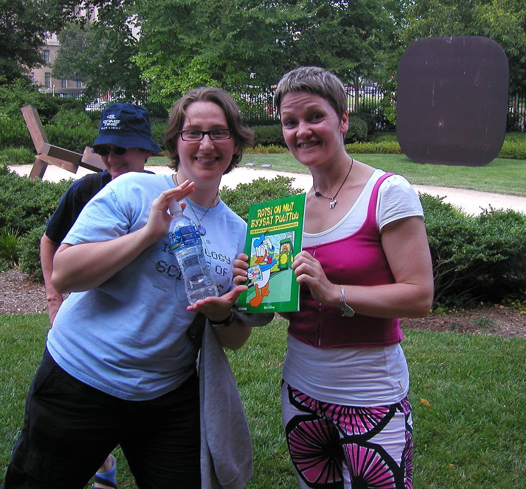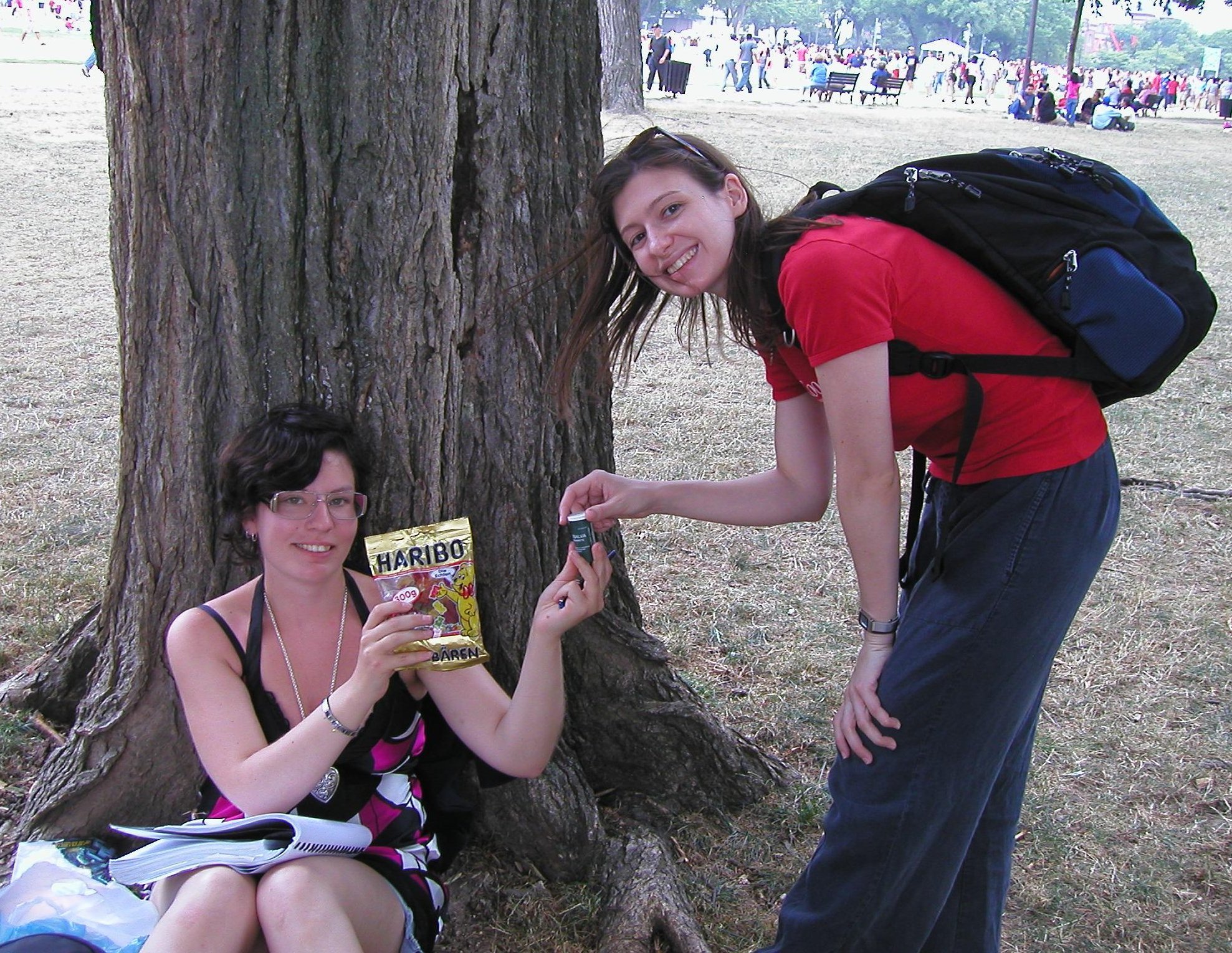 My partner was Kaitlin, but we were also joined by Kim, her mother, and her brother, who all wanted to watch some trading. We began by seeking out those nearby the metro stop. Many of them had already been hit by other groups (we could tell from the crayons they were holding), but even some of those were still helpful and interested in trading. We first traded for a tampon, which I was frankly skeptical of, but was assured by the two girls of how useful it was. And indeed, we quickly traded up to a box of raisins, and from there, to a cigarette lighter shaped like a cigarette. This left us quite well prepared for meeting up with a group of Germans (smokers all), from whom we received a bag of authentic German gummi bears (GUmmi Baeren!) in exchange for the lighter. This bag of gummi bears would stay with us for a while (as many people correctly asked, "what could be better than gummi bears?"). We also traded Kaitlin's crayon for a box of matches, and from there to a bottle of water. This bottle of water we traded to a family for a Finnish slang comic book (in which Donald Duck exclaims that he has trousers, but has no pants). It seemed impossible for us to find something more bizarre (and indeed, we did not). At this point, we plateaued for a while, since we could not find anyone who had something bigger, better, or more bizarre than either of these. People were generally very eager to trade (We always started off by saying it was "a kind of scavenger hunt". Everyone loves helping out with scavenger hunts. i'm not sure why this compulsion exists, but it gives me renewed faith in people's willingness to be bizarre.). they never seemed to care as much about the value of the trade as about taking part in the trading. Several Americans thought we were trying to proselytize some strange religion or sell them some strange service, and quickly sent us on our way. But our Scandanavian friends came through again when we made our final trade; in exchange for the gummi bears, we received Swedish military chapstick. This amazing substance can be used not only for protecting chapped lips, but also any other chapped part of the body, as well as being able to grease a pan; most impressively, though, in a pinch they can be eaten as emergency rations!