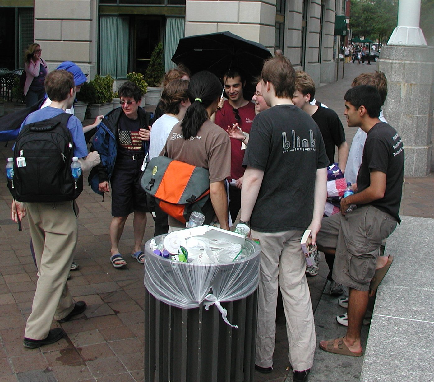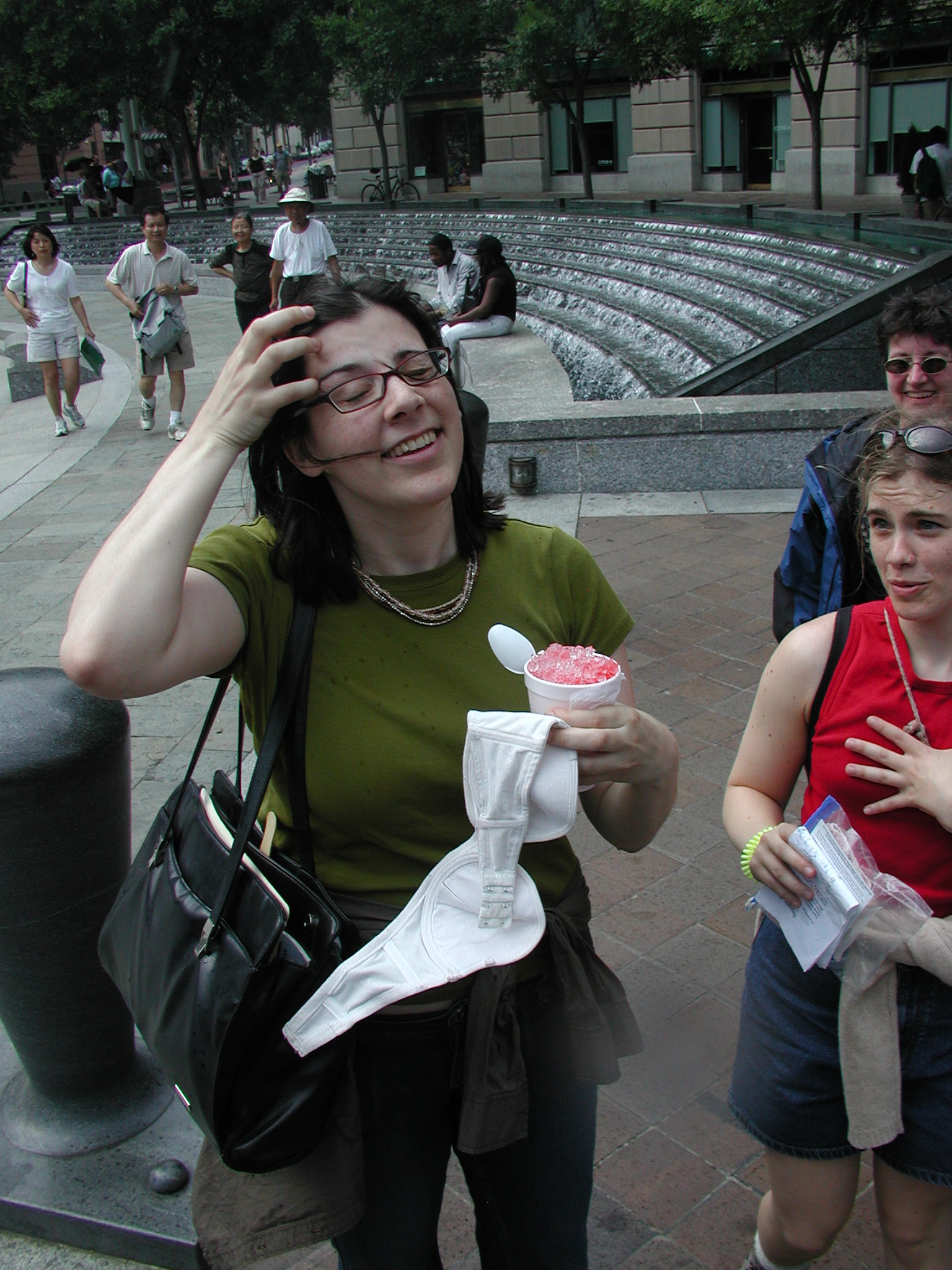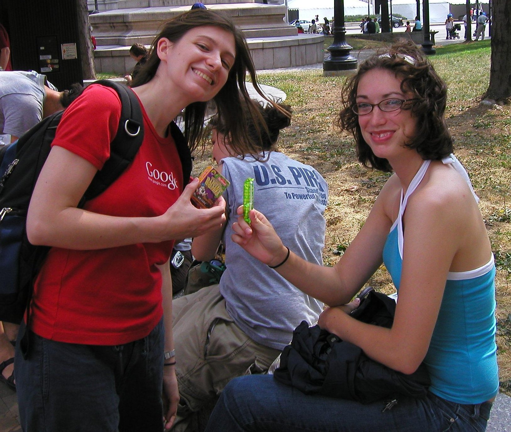 My partner was Kaitlin, but we were also joined by Kim, her mother, and her brother, who all wanted to watch some trading. We began by seeking out those nearby the metro stop. Many of them had already been hit by other groups (we could tell from the crayons they were holding), but even some of those were still helpful and interested in trading. We first traded for a tampon, which I was frankly skeptical of, but was assured by the two girls of how useful it was. And indeed, we quickly traded up to a box of raisins, and from there, to a cigarette lighter shaped like a cigarette. This left us quite well prepared for meeting up with a group of Germans (smokers all), from whom we received a bag of authentic German gummi bears (GUmmi Baeren!) in exchange for the lighter. This bag of gummi bears would stay with us for a while (as many people correctly asked, "what could be better than gummi bears?"). We also traded Kaitlin's crayon for a box of matches, and from there to a bottle of water. This bottle of water we traded to a family for a Finnish slang comic book (in which Donald Duck exclaims that he has trousers, but has no pants). It seemed impossible for us to find something more bizarre (and indeed, we did not). At this point, we plateaued for a while, since we could not find anyone who had something bigger, better, or more bizarre than either of these. People were generally very eager to trade (We always started off by saying it was "a kind of scavenger hunt". Everyone loves helping out with scavenger hunts. i'm not sure why this compulsion exists, but it gives me renewed faith in people's willingness to be bizarre.). they never seemed to care as much about the value of the trade as about taking part in the trading. Several Americans thought we were trying to proselytize some strange religion or sell them some strange service, and quickly sent us on our way. But our Scandanavian friends came through again when we made our final trade; in exchange for the gummi bears, we received Swedish military chapstick. This amazing substance can be used not only for protecting chapped lips, but also any other chapped part of the body, as well as being able to grease a pan; most impressively, though, in a pinch they can be eaten as emergency rations!