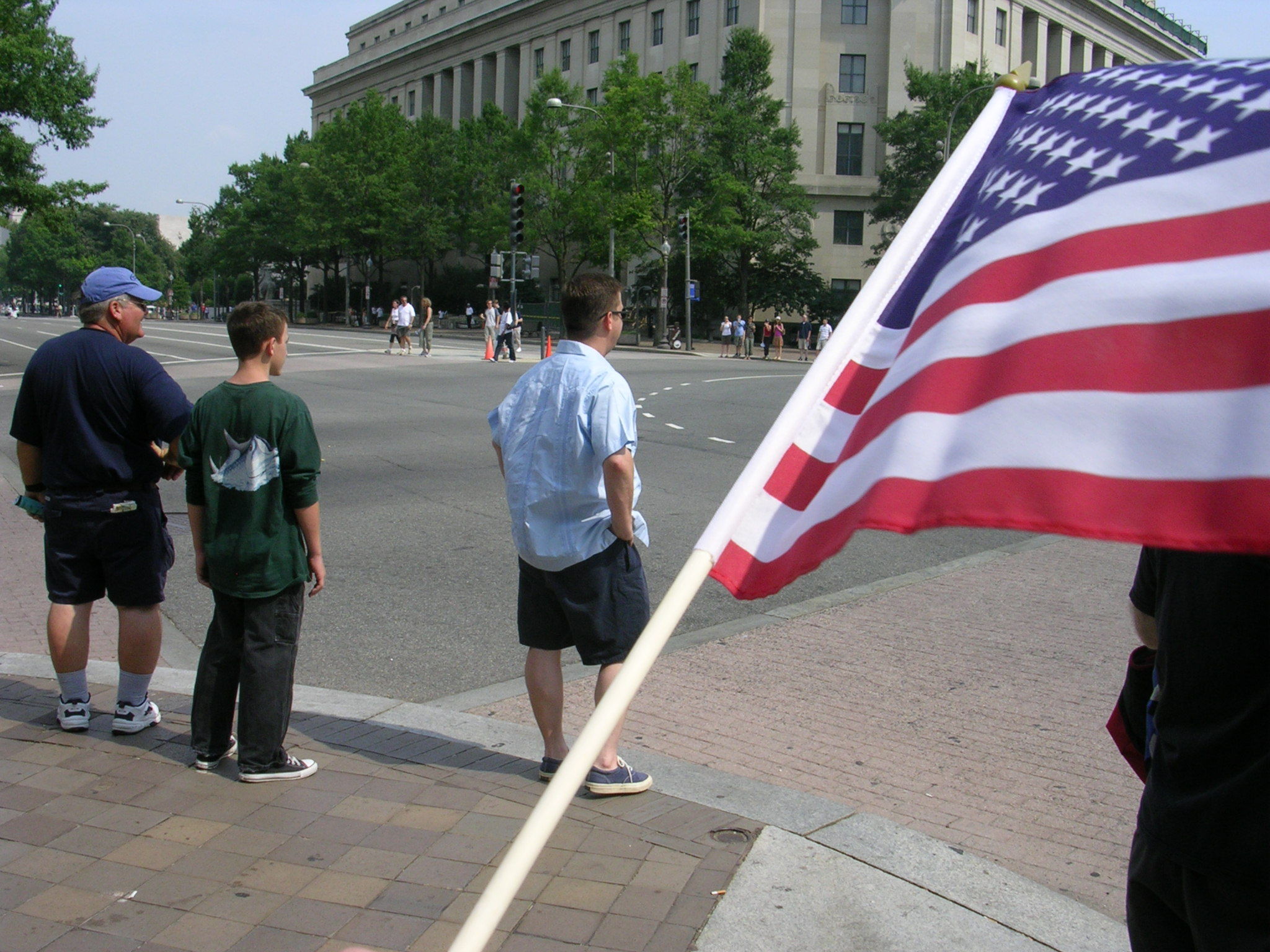 We began by deciding we had the chutzpah to approach someone selling U.S. flags for two dollars and ask him if he'd trade us a flag for a crayon. Although he insisted that that didn't sound like a fair exchange, when we said the crayon was "all we have", he gave us a flag and refused to take a crayon. So far, so good.