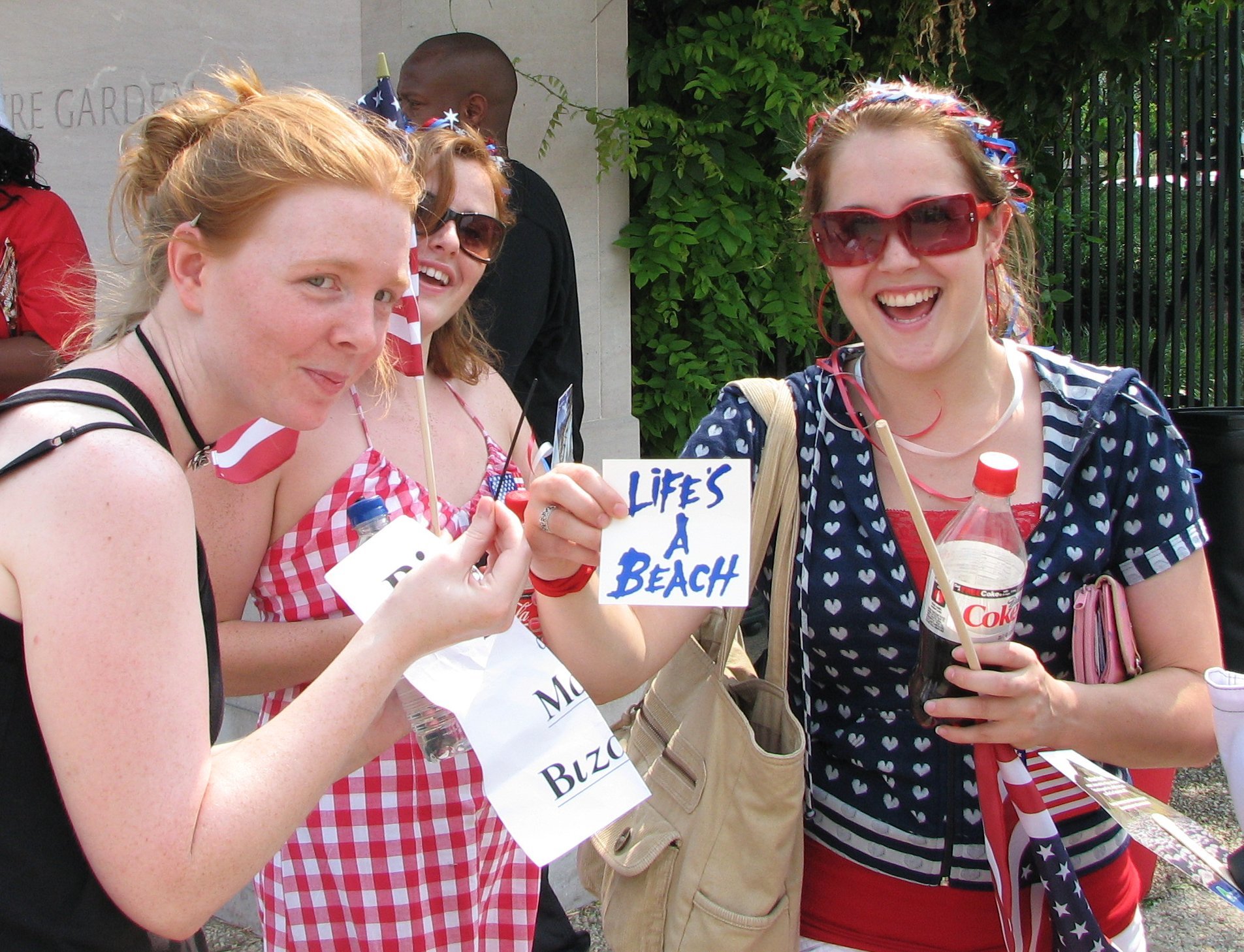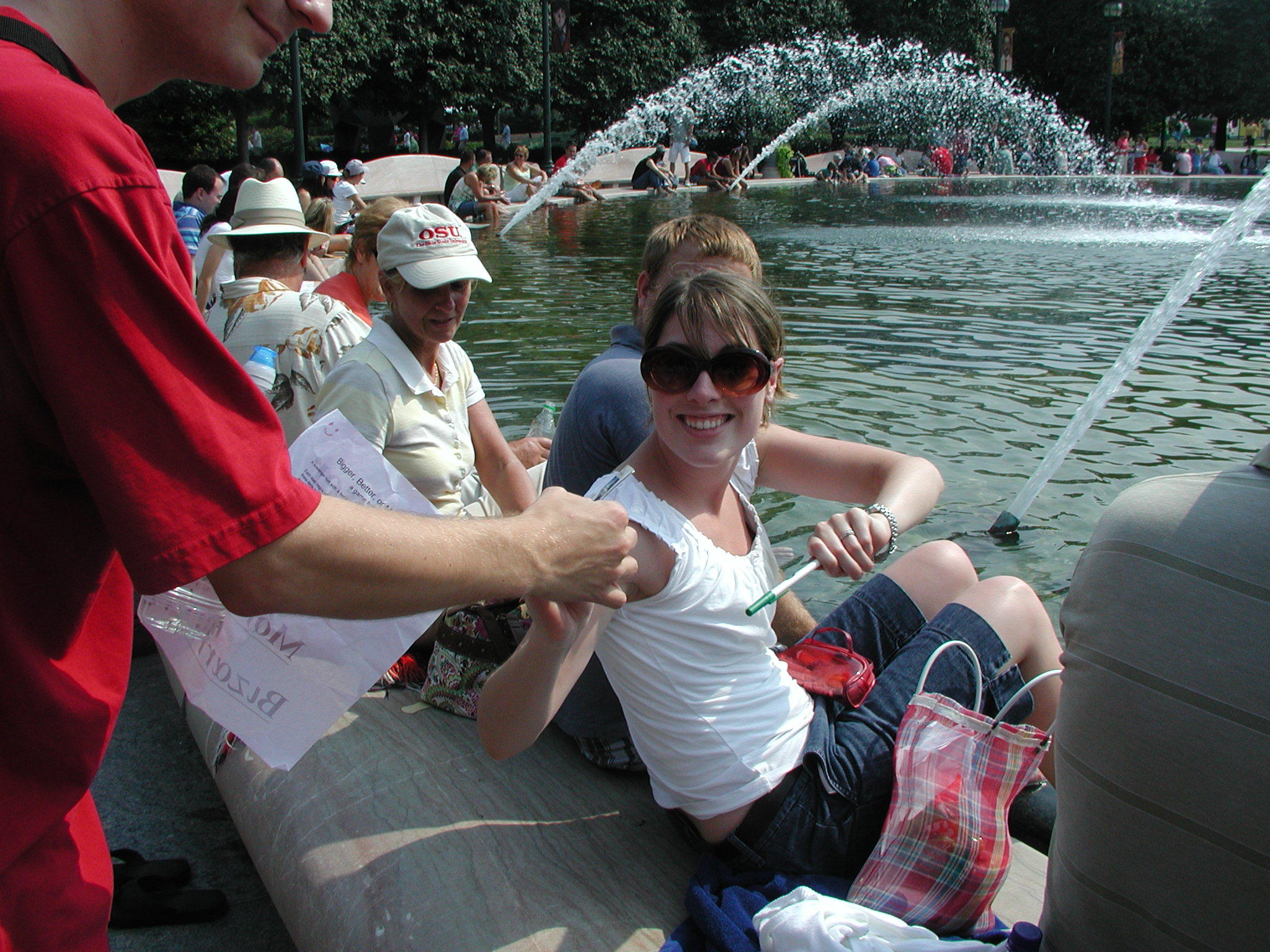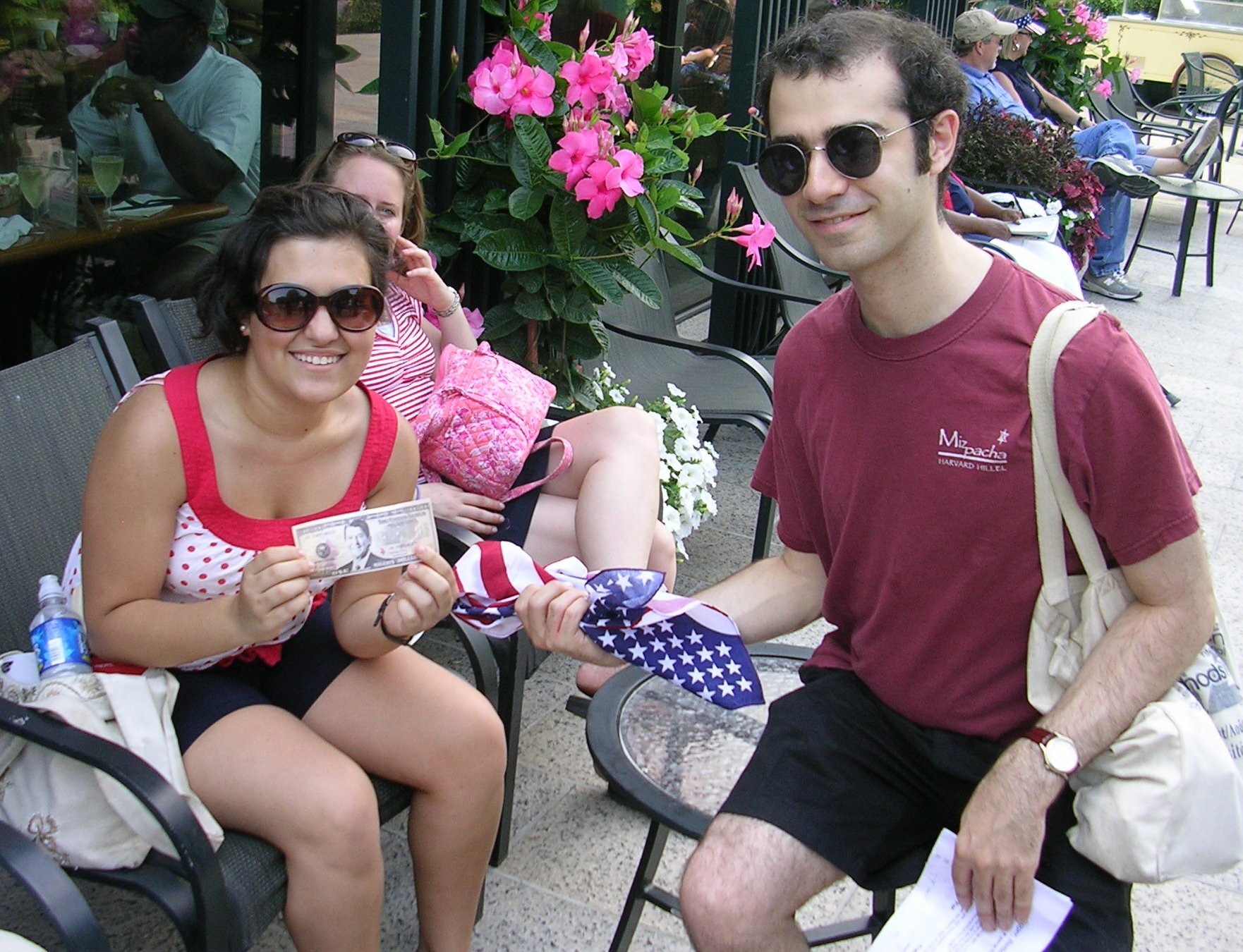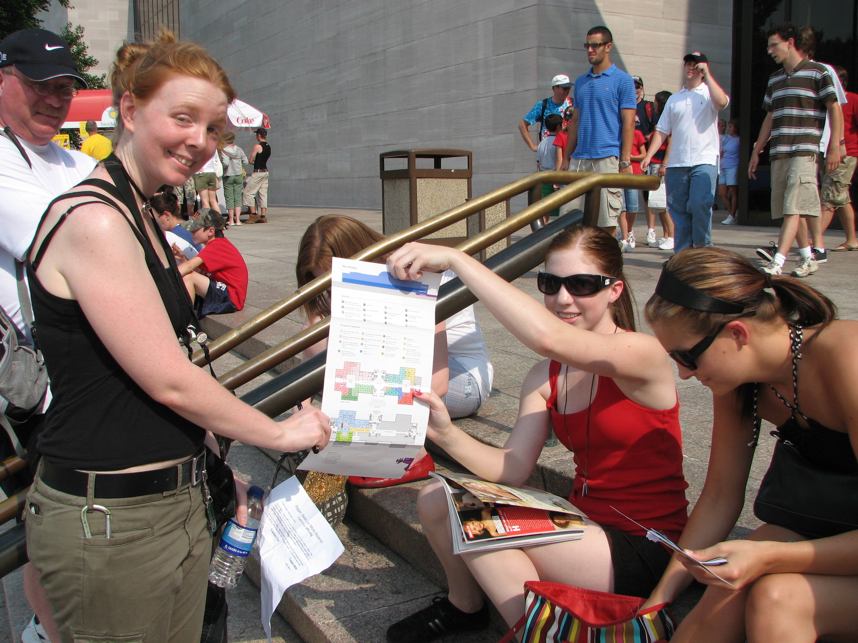 Our other moment of revelation was when someone gave us a flyer promoting Hare Krshna, and a pamphlet warning us about religious fanatics handing out pamphlets. That was when we realized there were people GIVING weird stuff away. That's when we realized that we could trade one of the pamphlets for three maps of the National Mall, the maps for two more fans, one of the fans for two American flag stickers, and one of the maps for two more fans.