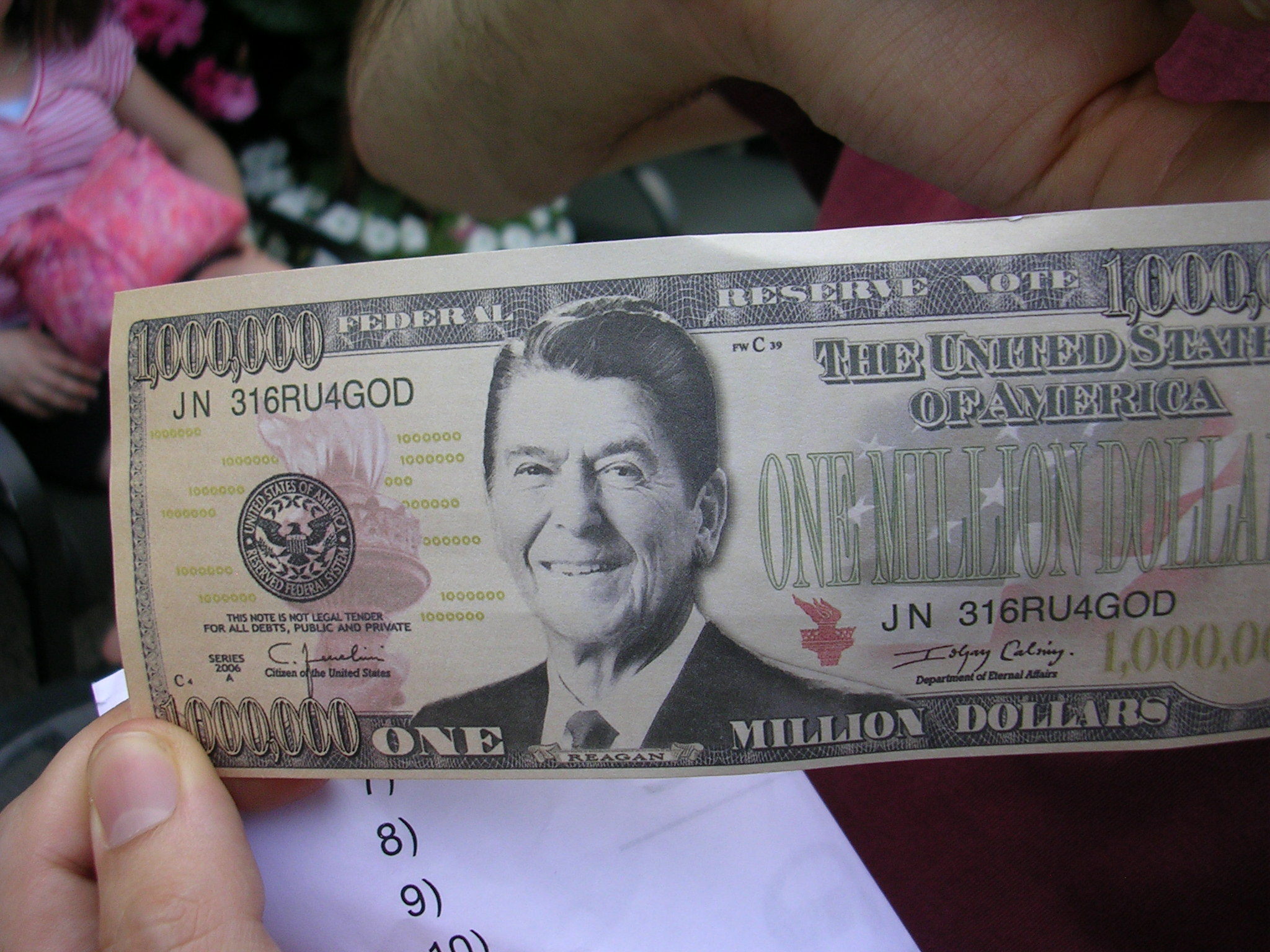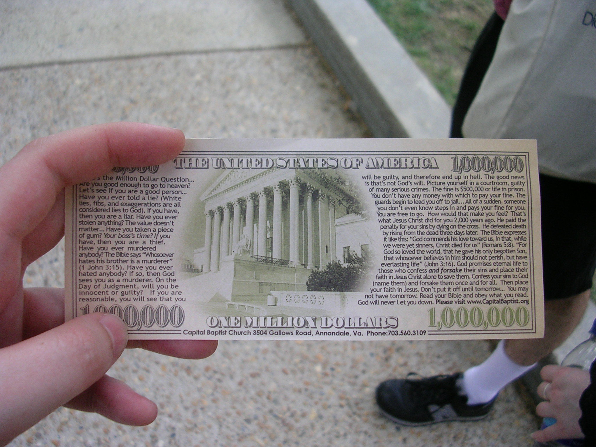 We decided our best strategy would be to approach people who seemed to be in their twenties to mid-thirties, sitting around or waiting, who had backpacks or purses, and tell them we were doing a scavenger hunt. In short order we traded the flag for a flag-pattern bandanna, and the bandanna for a fake million-dollar bill with Ronald Reagan's face on it and advice on the back about how to avoid going to hell, printed by the Capital Baptist Church. At receiving something as bizarre as this, our standards went up: bigger and better alone wouldn't cut it; we needed something at least as bizarre as well.