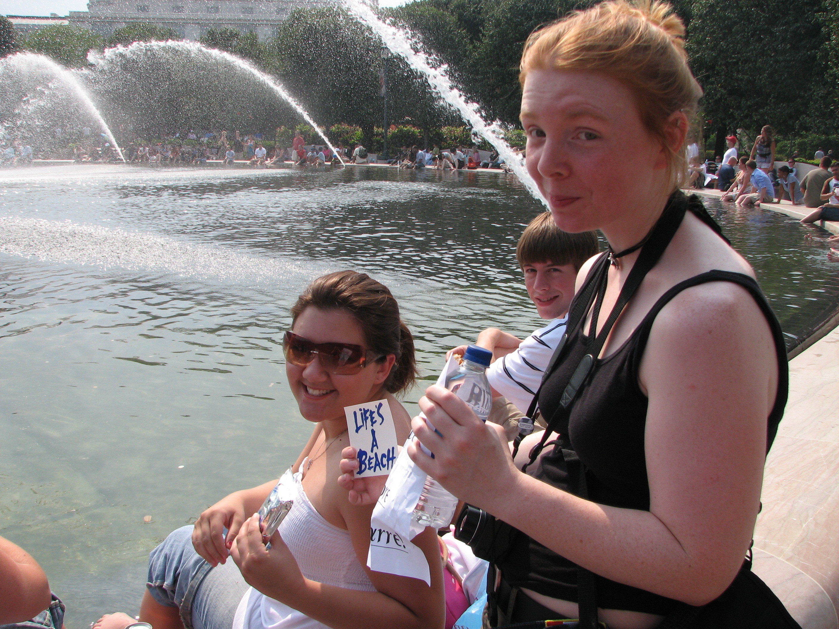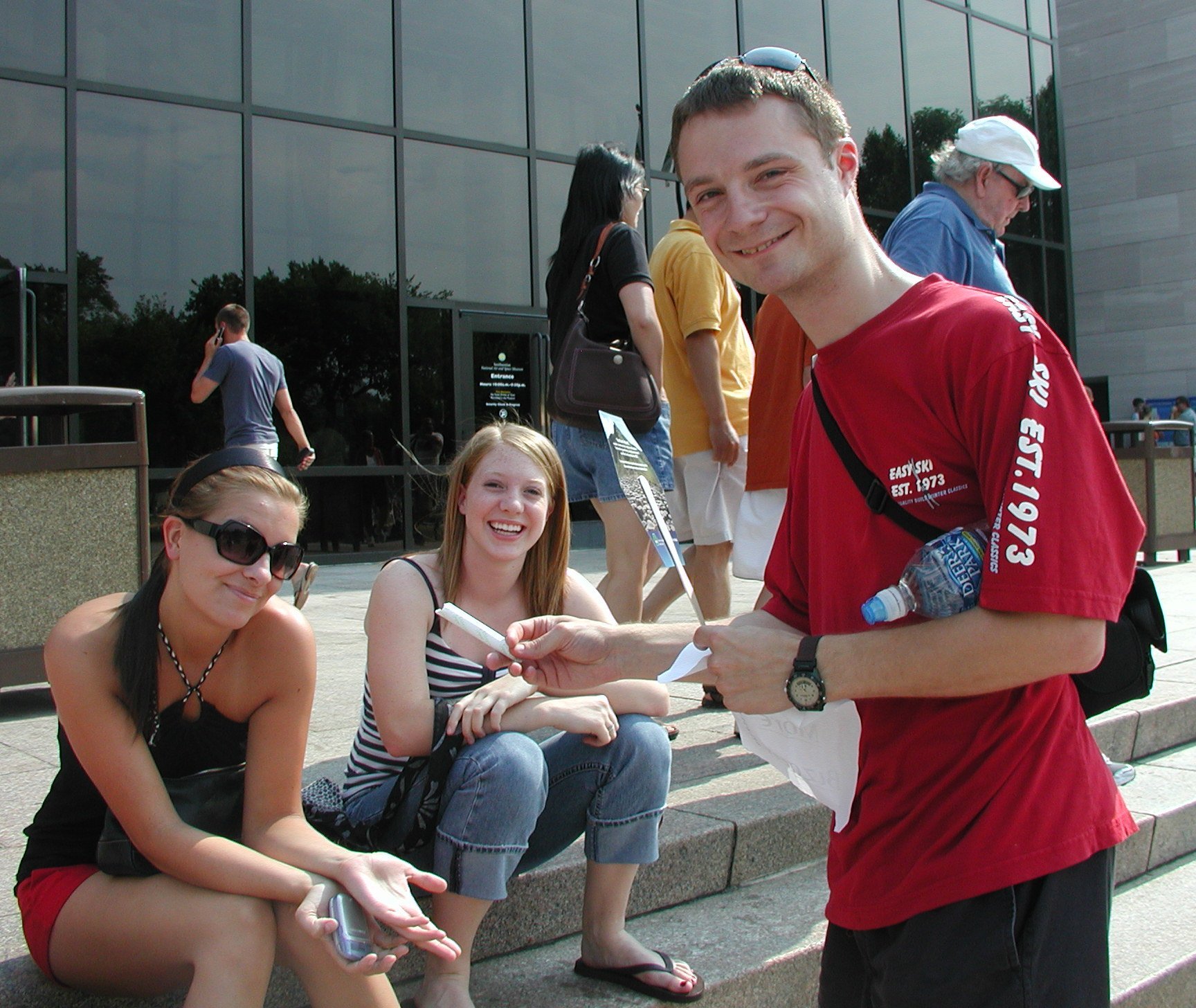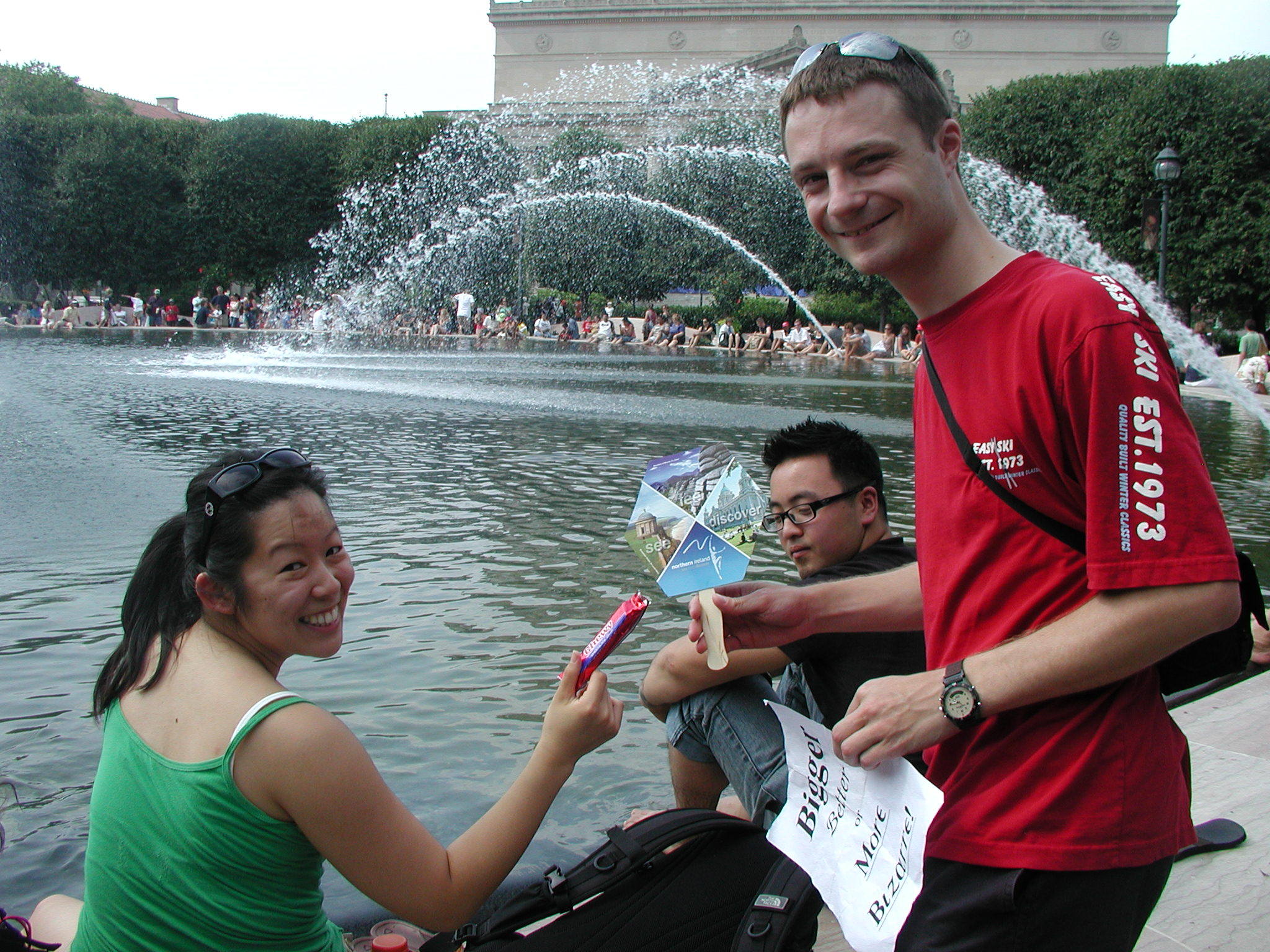 Our fortunes were about to take a turn for the worse, since we then immediately passed the 'free fan' and 'get your salvation here' stands, offering endless supplies of both fans AND tracts to the public. Knowing it would be difficult to trade in such a saturated market, we headed up and across the Mall to the steps of the Smithsonian Air and Space Museum. Here we found a triplet of good-humoured teenage girls, who were more than happy to exchange my fan for a tampon (super size), and Flitworth's document for a map.