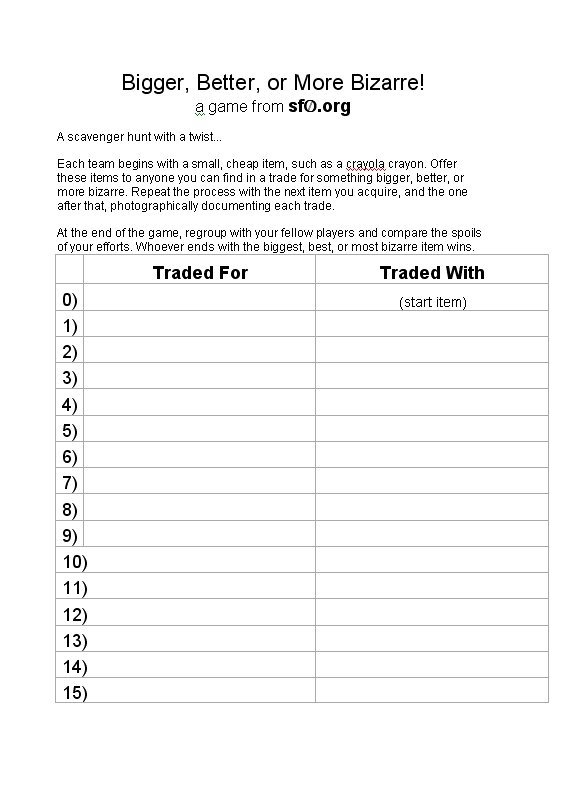 and also the number of bottles of water in a cvs package. Everyone was matched into pairs (with one triplet), and each person was given a single crayon from the box of crayons, to begin their trading. Everyone was also given a bottle of water (even in the afternoon, the heat in DC can be daunting). I also printed out signs to make everyone seem more official--on one side, they proclaimed in simple terms "Bigger, Better, or More Bizarre!" and on the reverse gave the instructions and a list of entries to record trades.