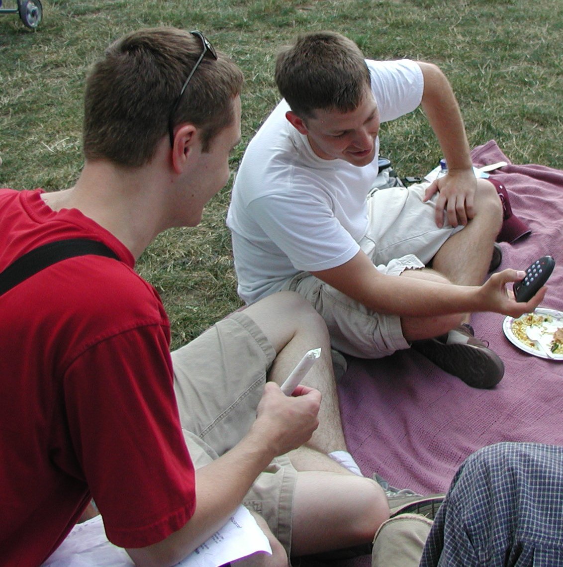 We approached several people and groups who seemed intrigued by the game and eager to participate, but none of them had anything they were willing to part with that could beat out the million-dollar bill (although one man said if we'd been doing it a few years earlier he would have given us his kids). One group of people on a picnic blanket seemed particularly enthusiastic and offered us a suction-cup ball, which we would have taken until they decided that it wasn't theirs to offer, and "Rebecca will kill us" if she came back and it was gone. We were prepared to move on, but they were determined to search everything they had to find something to offer us for the million-dollar bill. After spending a while offering us each other and various half-empty snack boxes, one of them offered to let us tear a page out of the _Zombie Survival Handbook_. This was an offer that was hard to turn down, and when we couldn't find a particular page we wanted to take, she let us take the whole book (as long as we let her read the last couple of pages first).