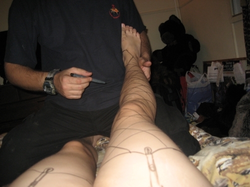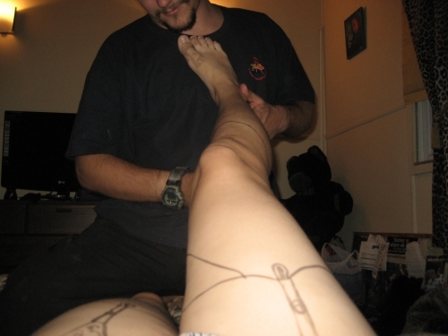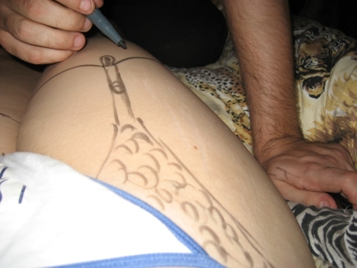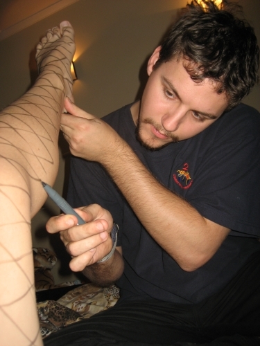 look at that concentration, my living canvas is squirming and complaining it tickles, but i will not be detracted from my doodling.
