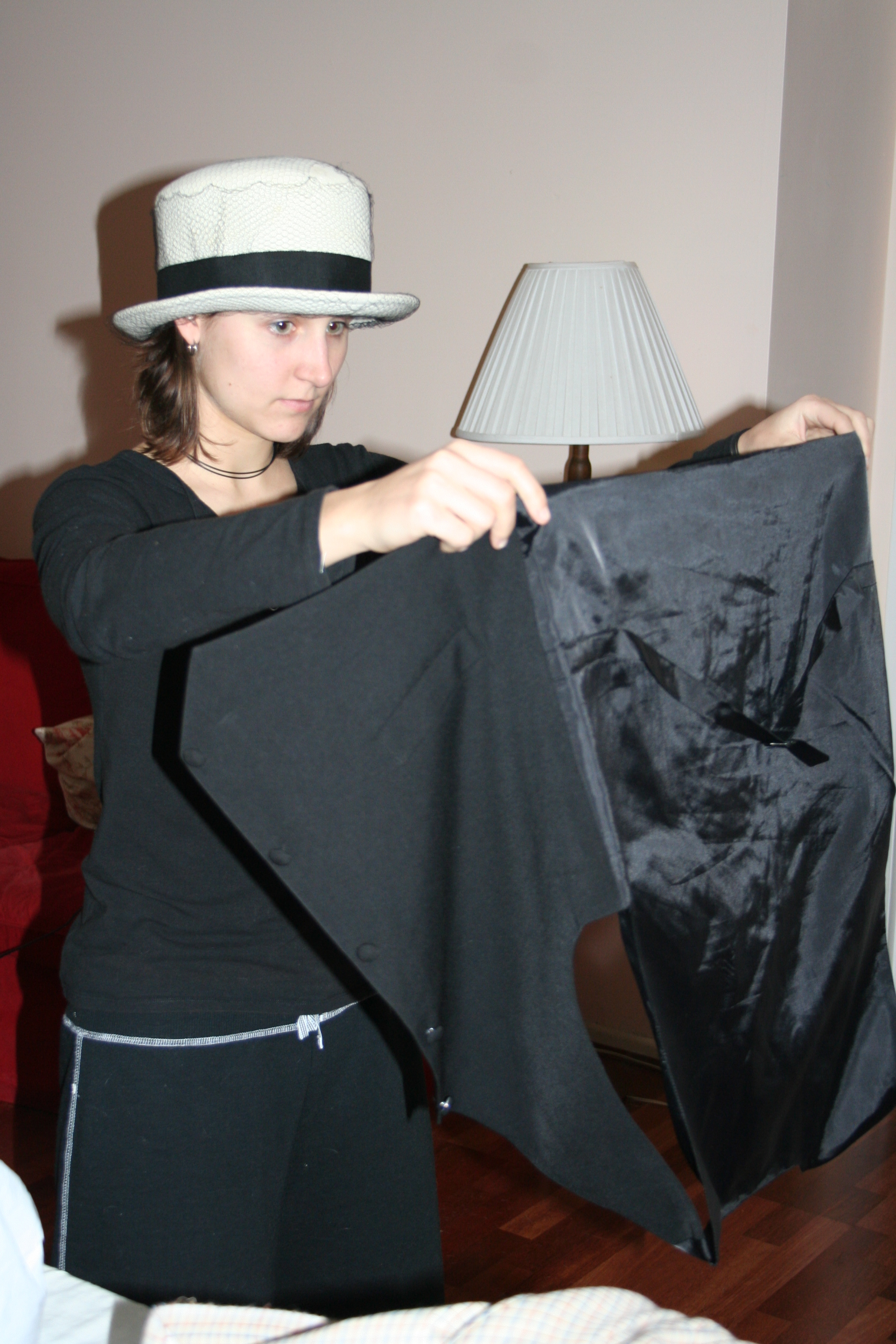 And now: how to make one. Step 1, get a template. here is one of my formal vests to be used as a model. if you can, recruit someone with textile skills, like my sister.