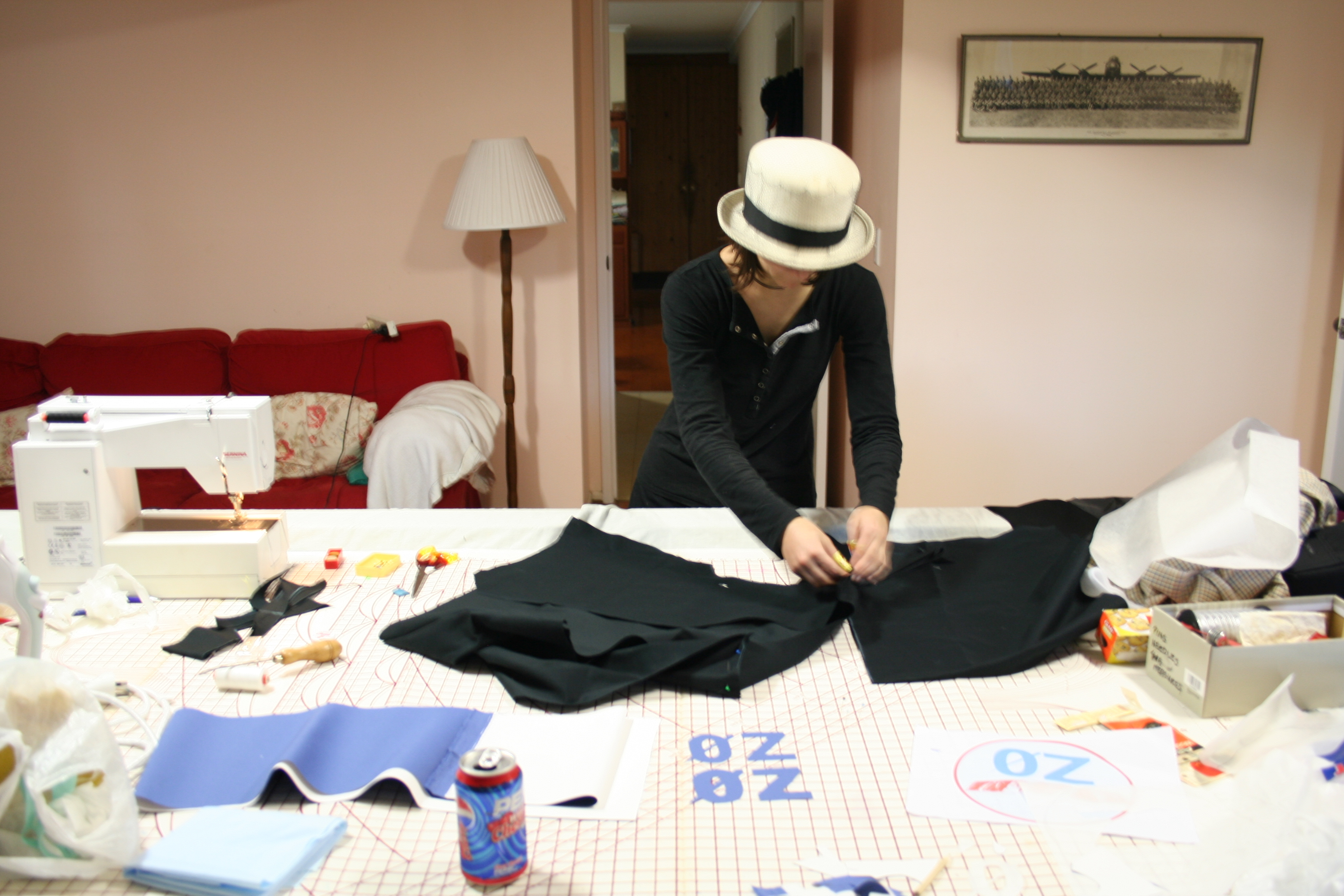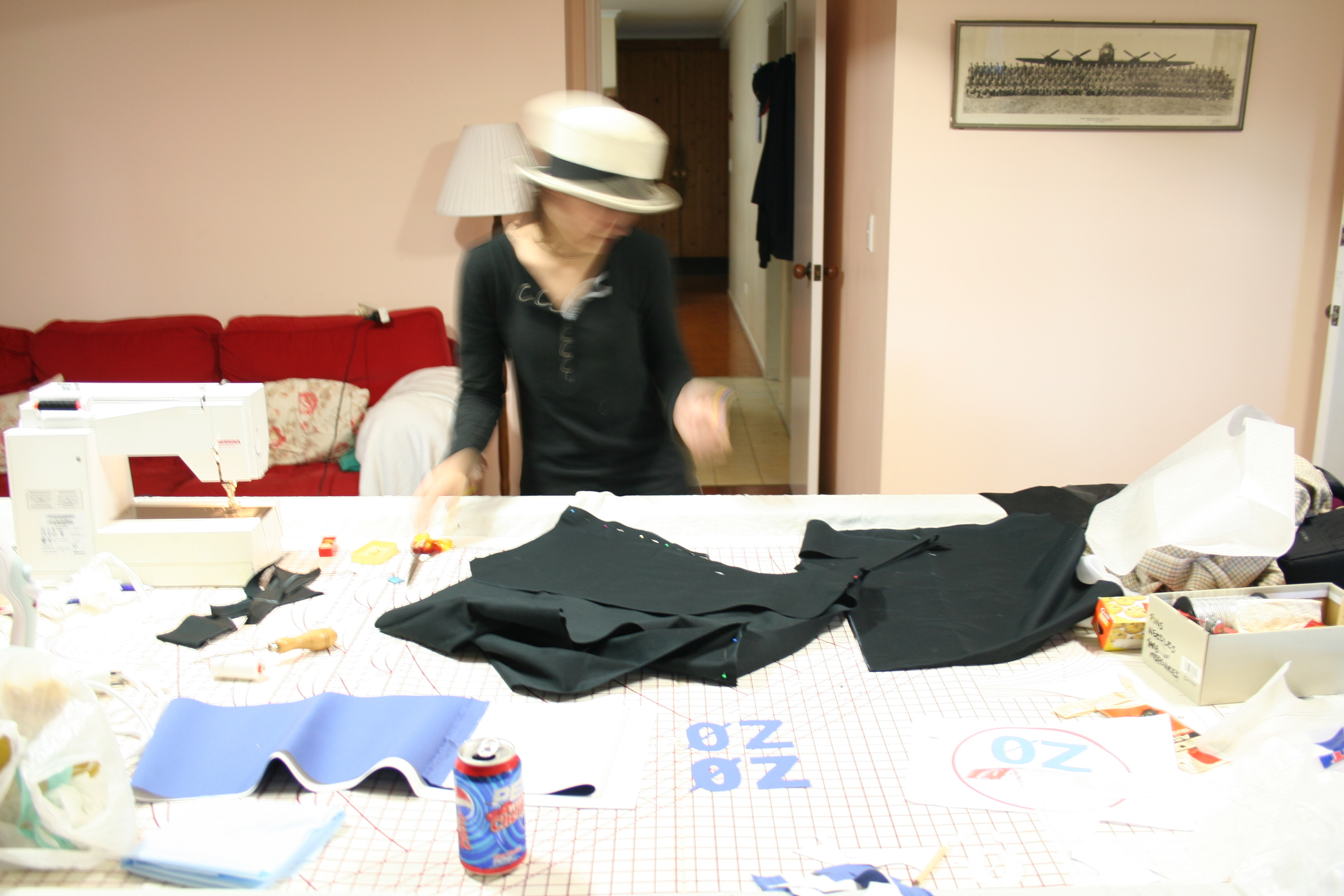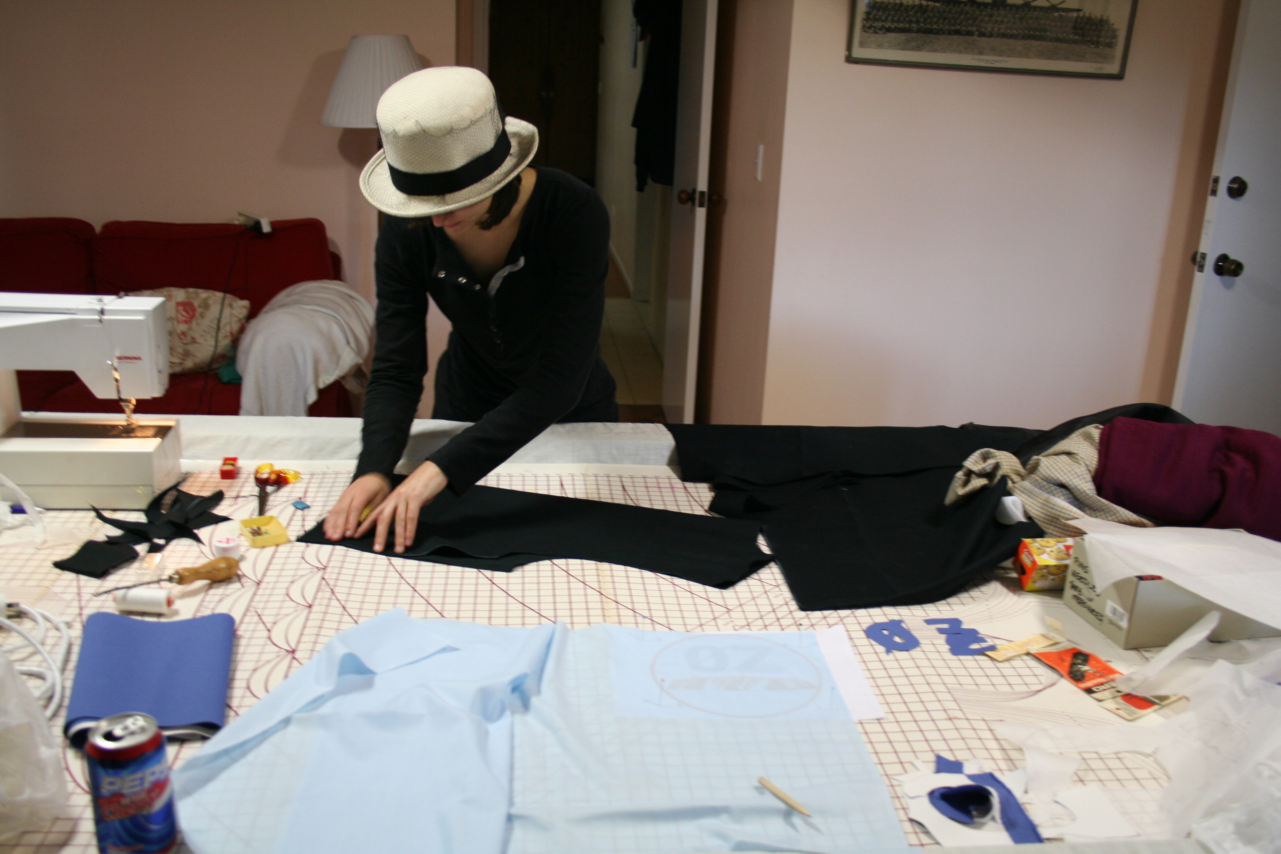 Get baking or tracing paper and lay the vest out on the paper, tracing each panel of fabric onto the paper. then cut it out and pin it to your drill fabric. arrange it so you get the best use of your fabric. then cut out the panels in the drill. you can see at the bottom i started working on the patch for the back while jen works on the vest. that blue material is curtain fabric.