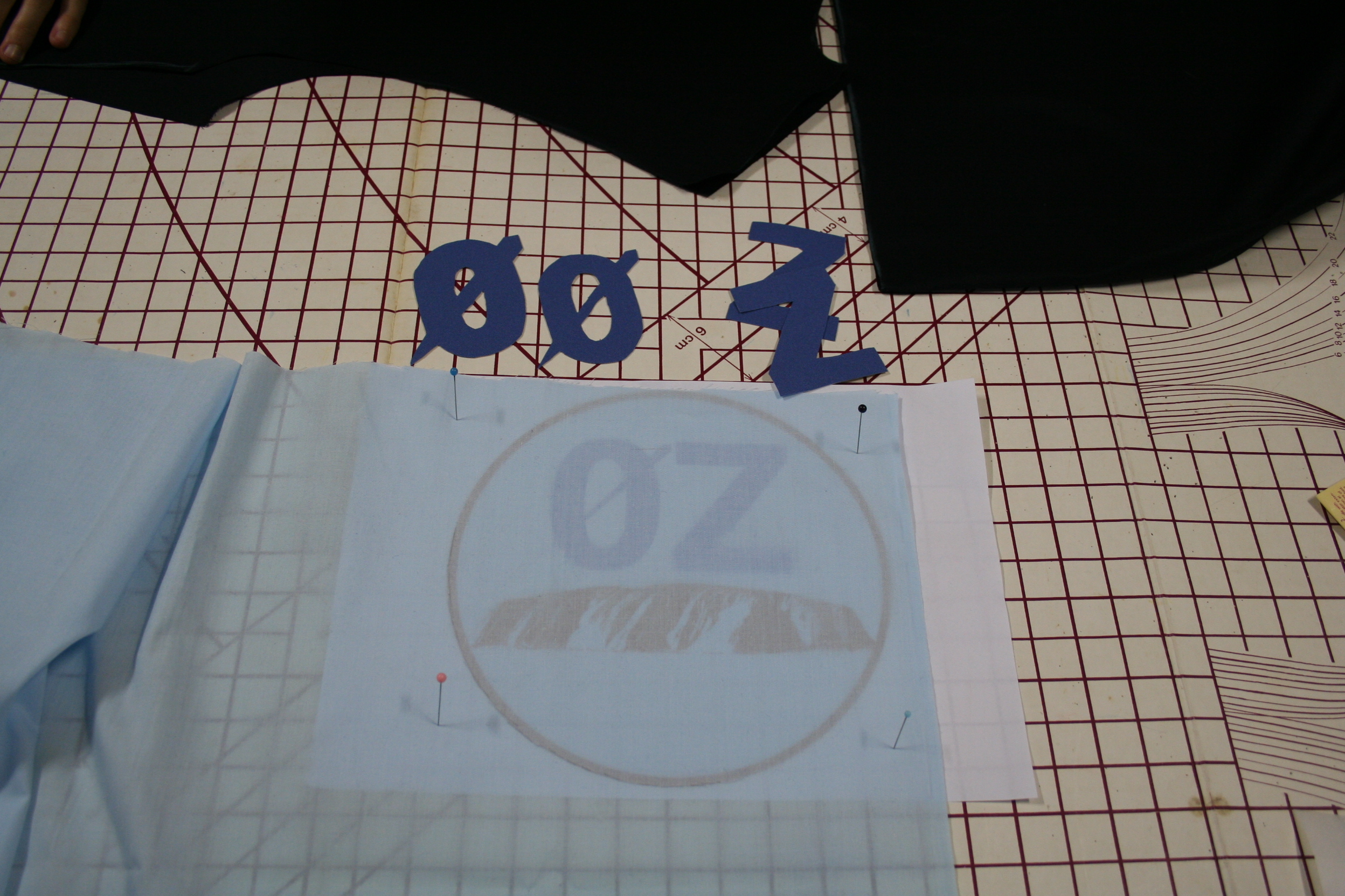 When cutting the fabric remember to allow for extra, these will be where you sew and when you sew all the panels together it will be inside out, then you turn it right side out, all they sewn seams will be on the inside. hurrah. for the patch, get some light blue fabric, red and darker blue textured fabric paint. print out your logo on a colour printer. then pin the blue fabric flat over the logo.