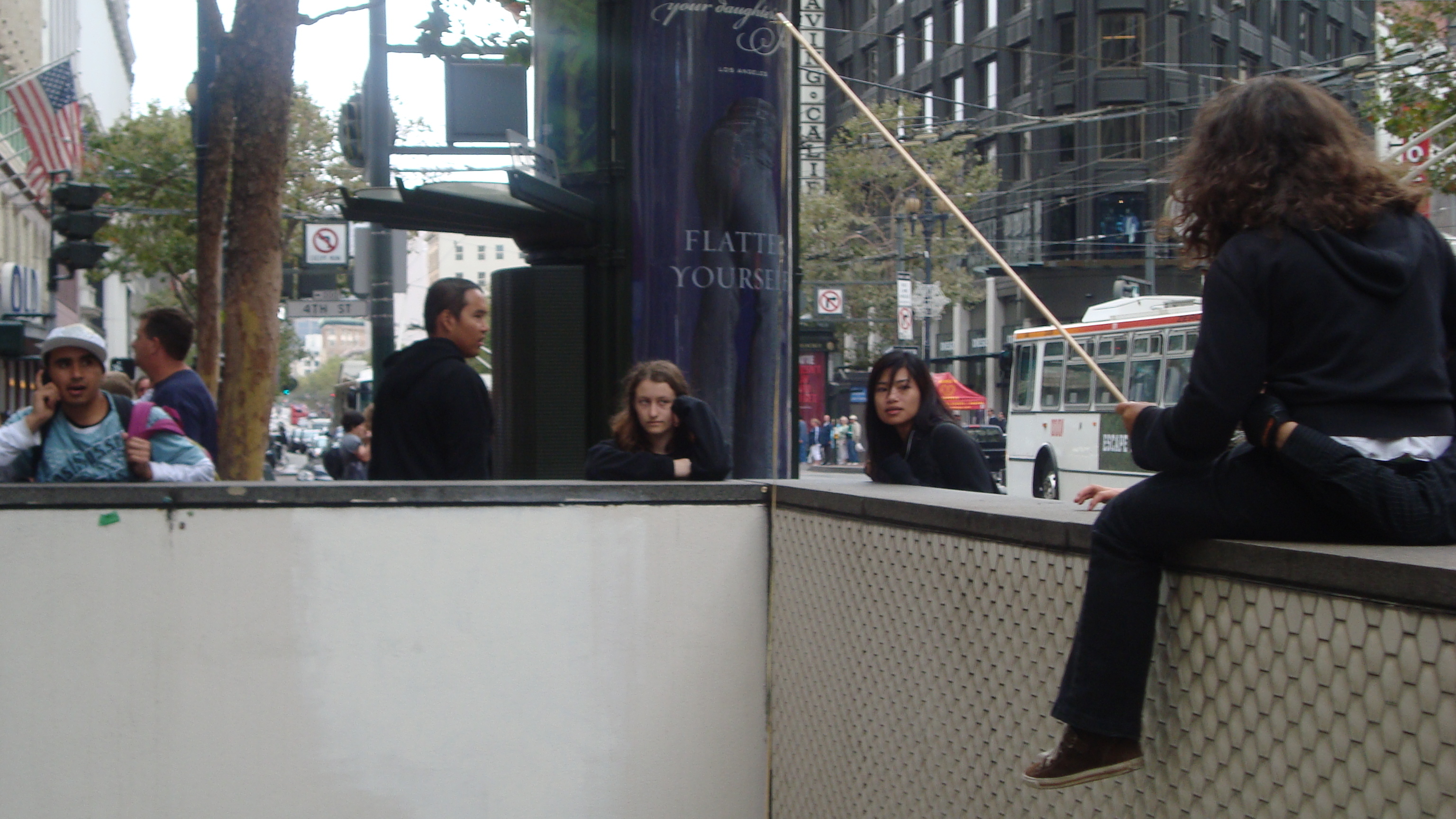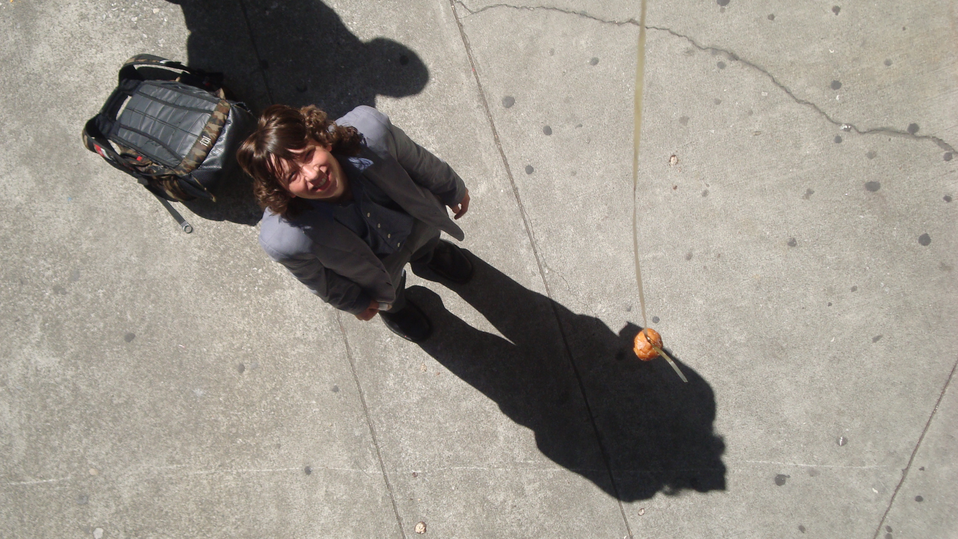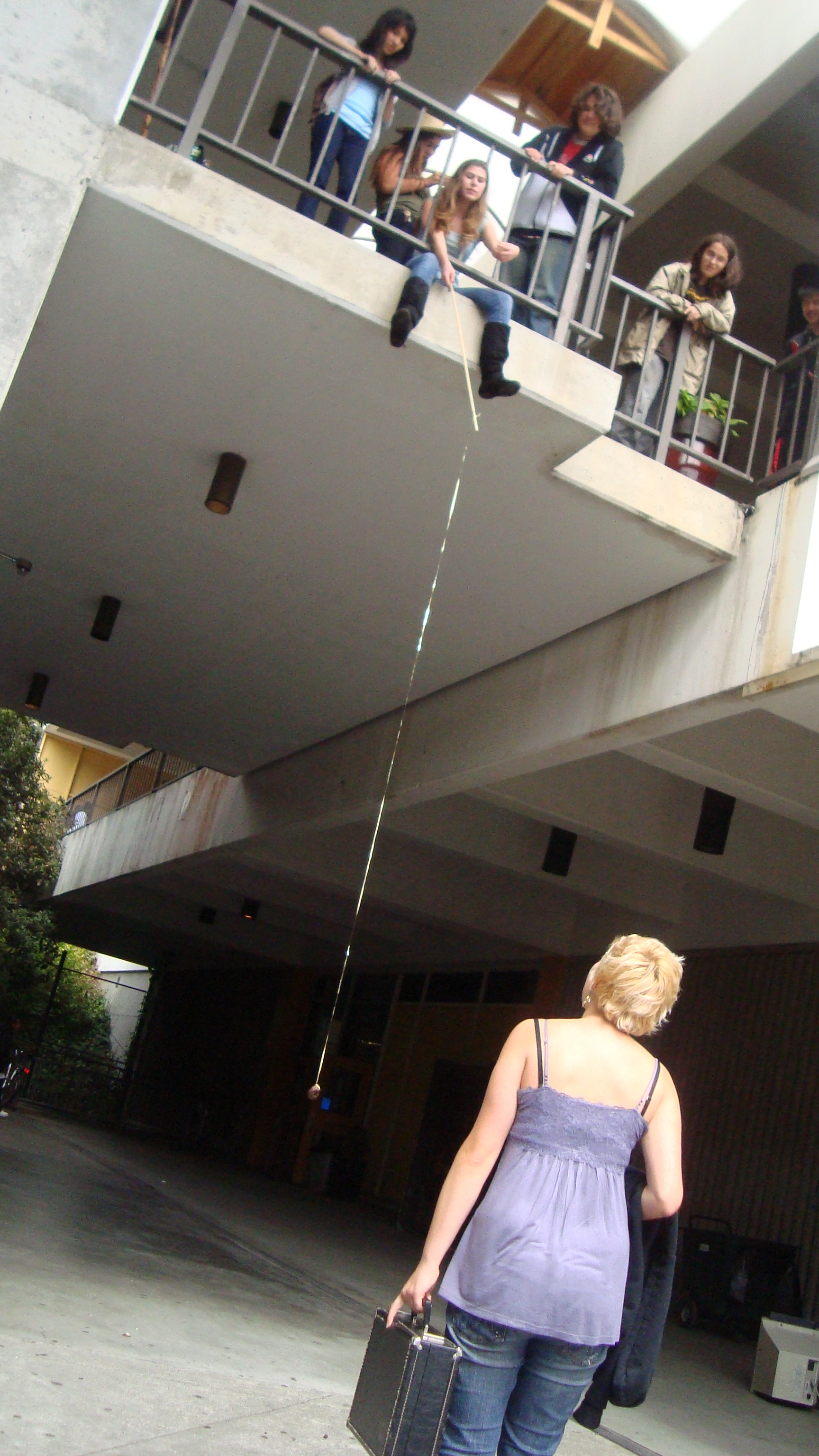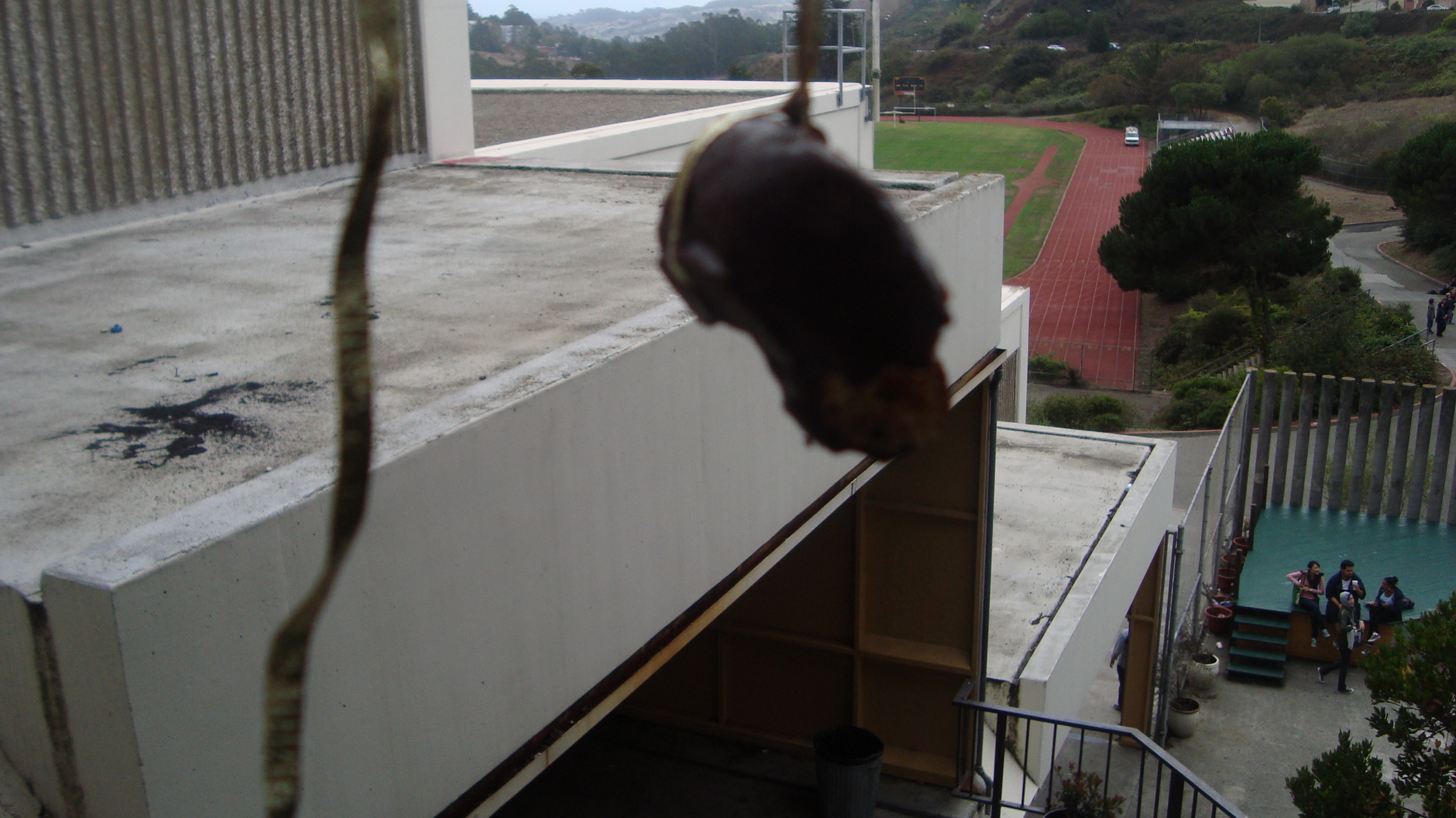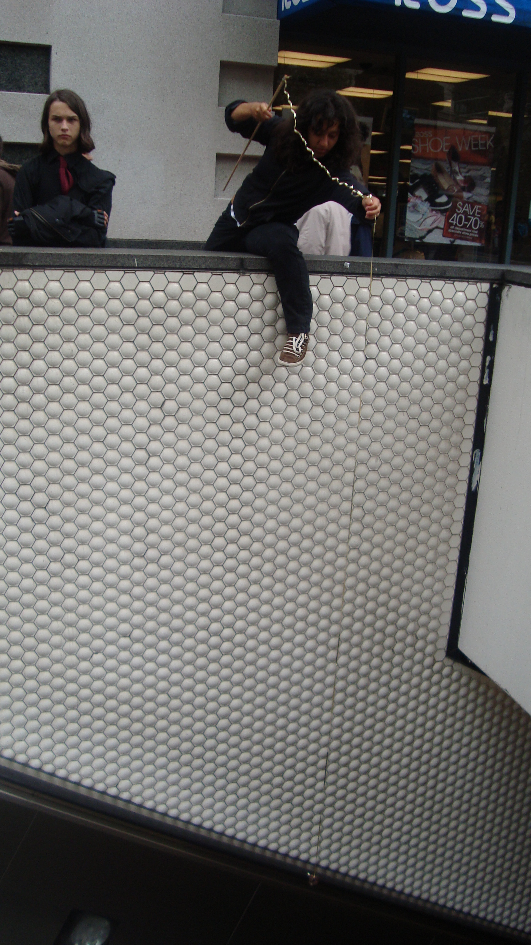 September 20th, 2009 9:30 PMWe first went to the dollar store and bought a package of five or six donuts, then bought a dowel from Cole Hardware to make a rod. Finally, we sat down at Yerba Buena and strung it up. The first girl came, a chubby little strawberry blonde in a pink outfit. She screamed: "I want it!" and took it. That was our first fish. We didn't get a photo of it, because Bryce ended up downstairs a little too late to take photos. After this, we were soon removed from the vicinity by the Yerba Buena Fuzz. We continued over a Bart station, but it was relatively unsuccessful. Finally, we decided that teenagers were the best fatties one could find. Teenagers eat anything, and they eat it with gusto, so we went fishing on monday and tuesday in the quad at SOTA. Initially, people didn't know what to make of it, but eventually it gained popularity and we had a crowd by tuesday. It was an incredibly impassioned event, and was colored by the many different characters...we had:
