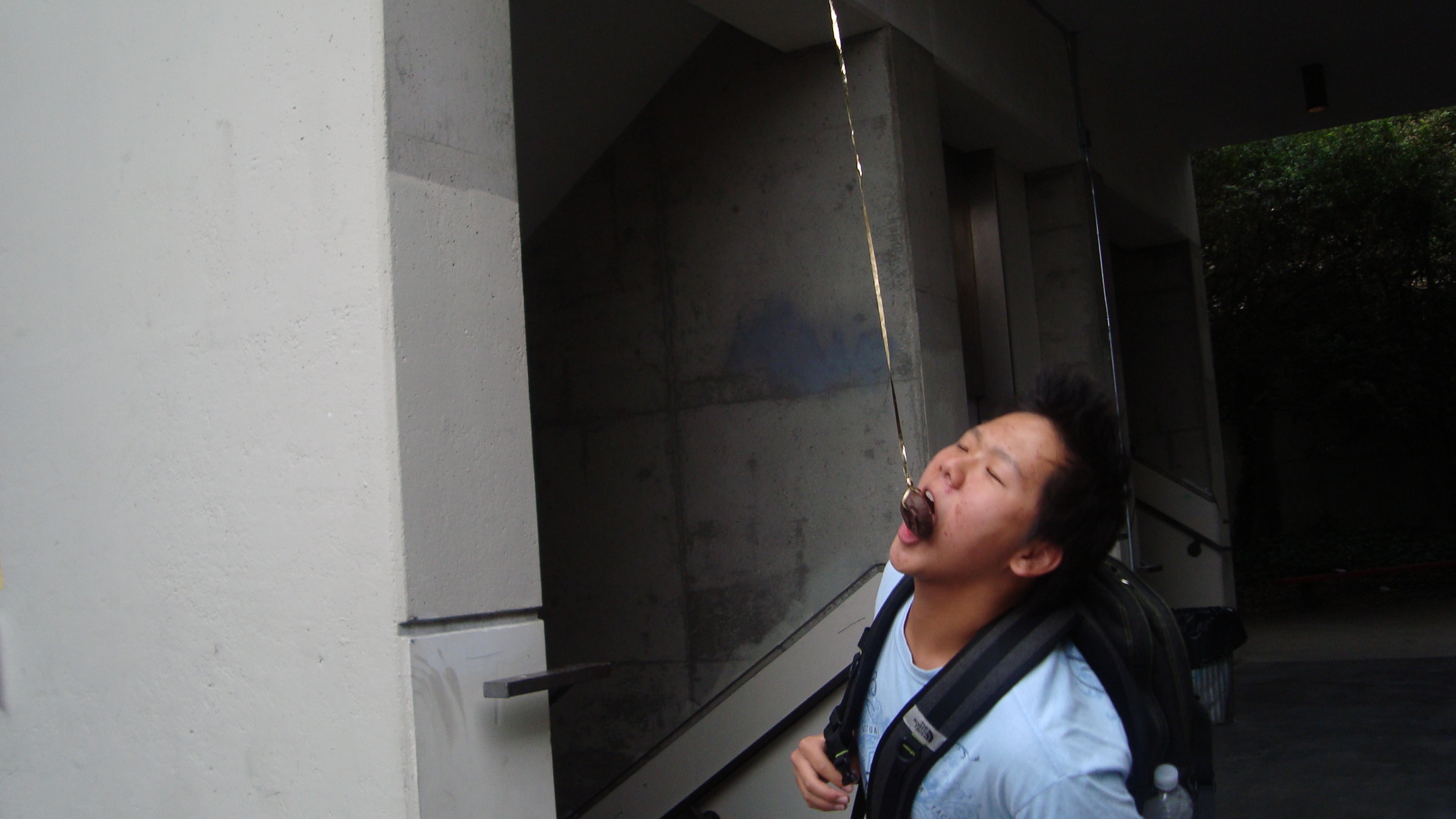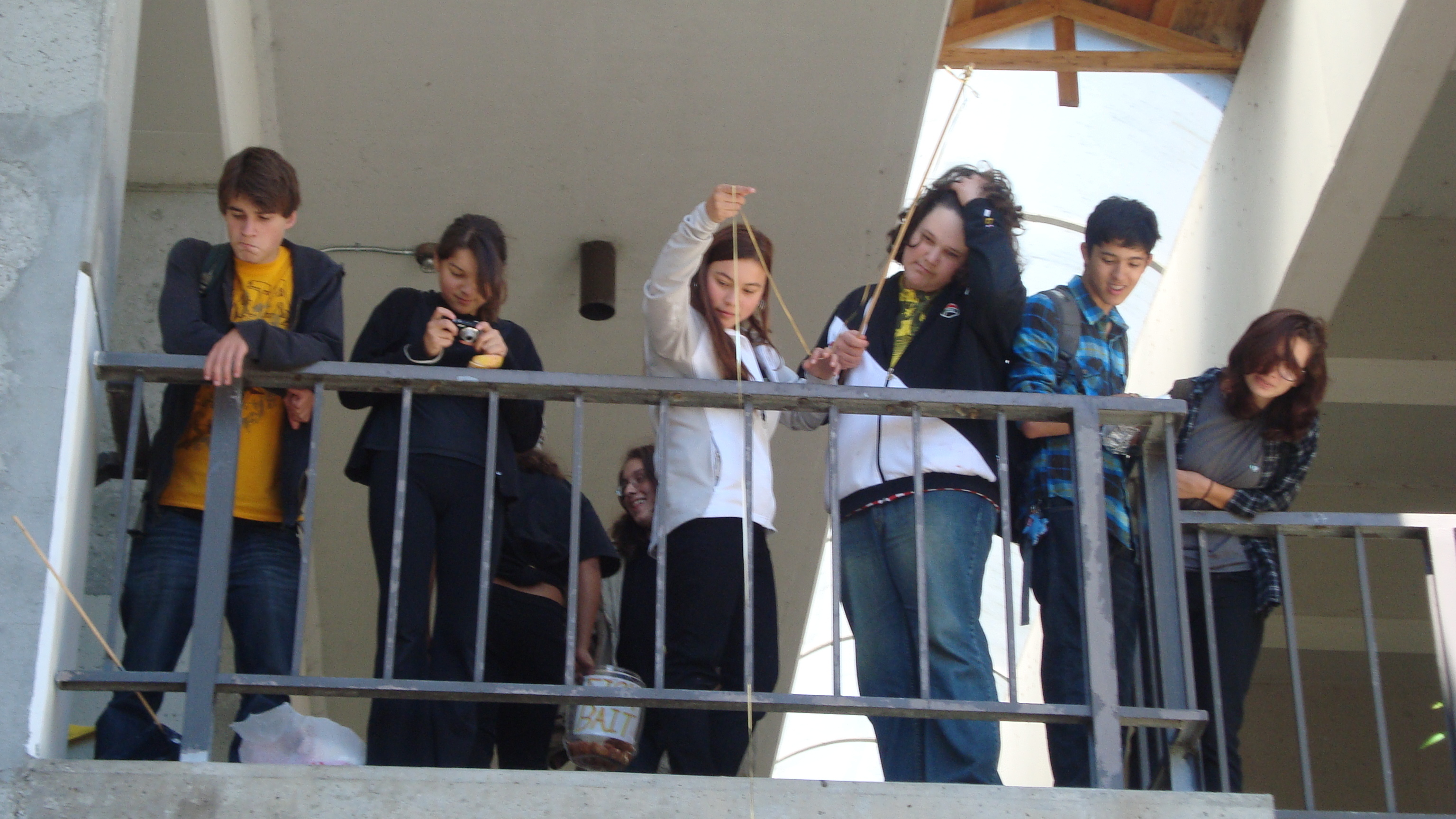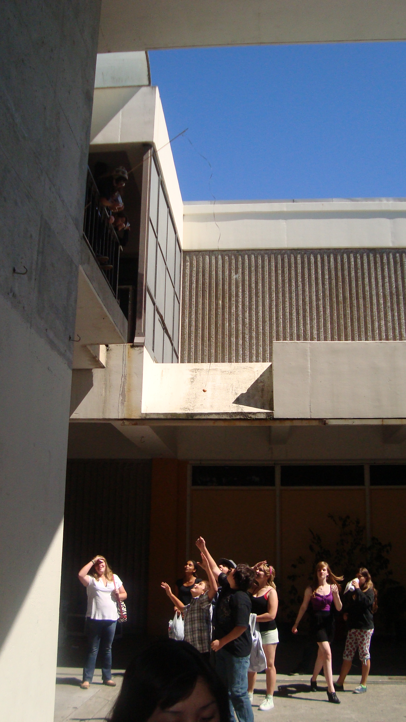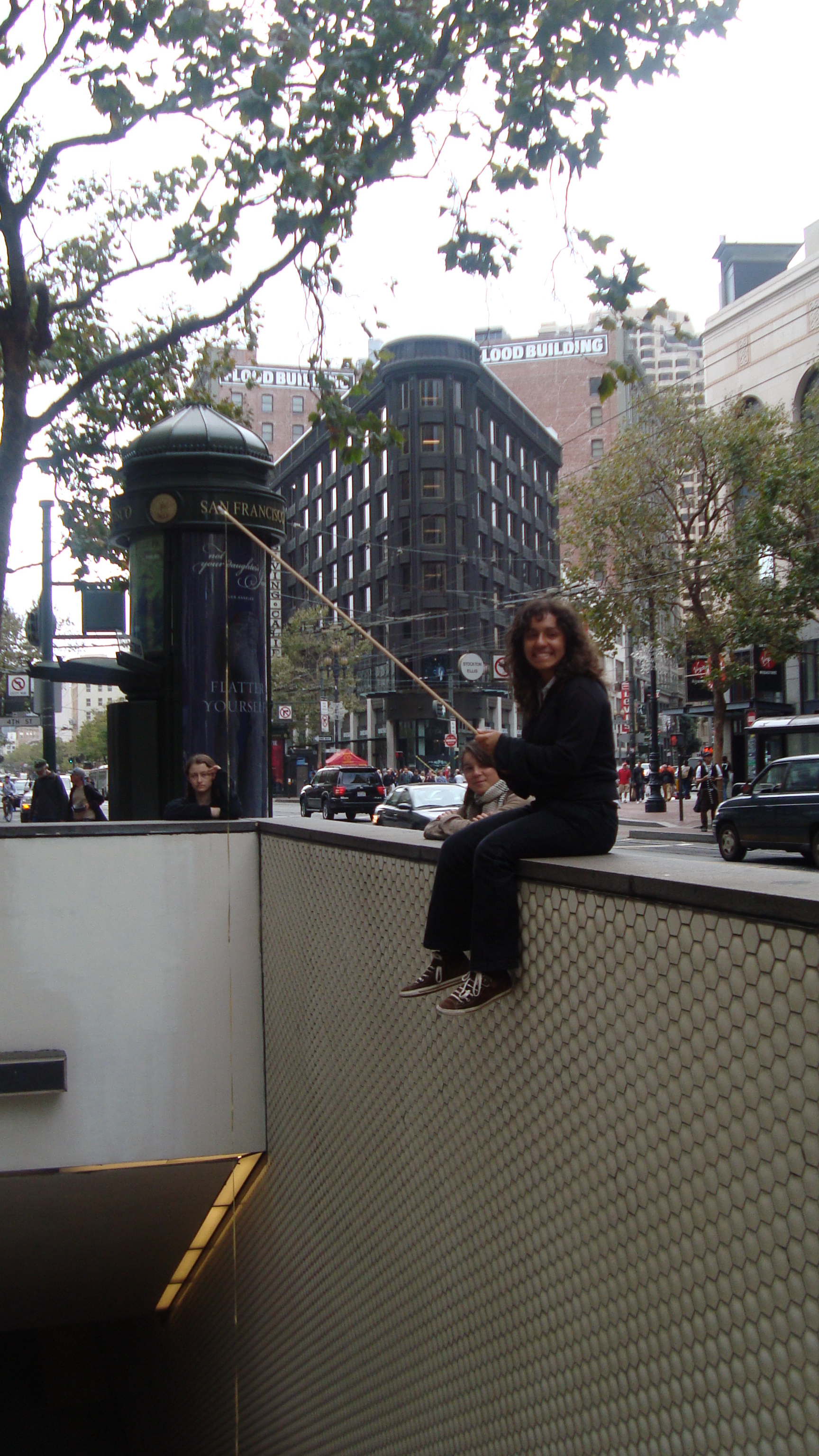 September 20th, 2009 9:30 PMWe first went to the dollar store and bought a package of five or six donuts, then bought a dowel from Cole Hardware to make a rod. Finally, we sat down at Yerba Buena and strung it up. The first girl came, a chubby little strawberry blonde in a pink outfit. She screamed: "I want it!" and took it. That was our first fish. We didn't get a photo of it, because Bryce ended up downstairs a little too late to take photos. After this, we were soon removed from the vicinity by the Yerba Buena Fuzz. We continued over a Bart station, but it was relatively unsuccessful. Finally, we decided that teenagers were the best fatties one could find. Teenagers eat anything, and they eat it with gusto, so we went fishing on monday and tuesday in the quad at SOTA. Initially, people didn't know what to make of it, but eventually it gained popularity and we had a crowd by tuesday. It was an incredibly impassioned event, and was colored by the many different characters...we had: