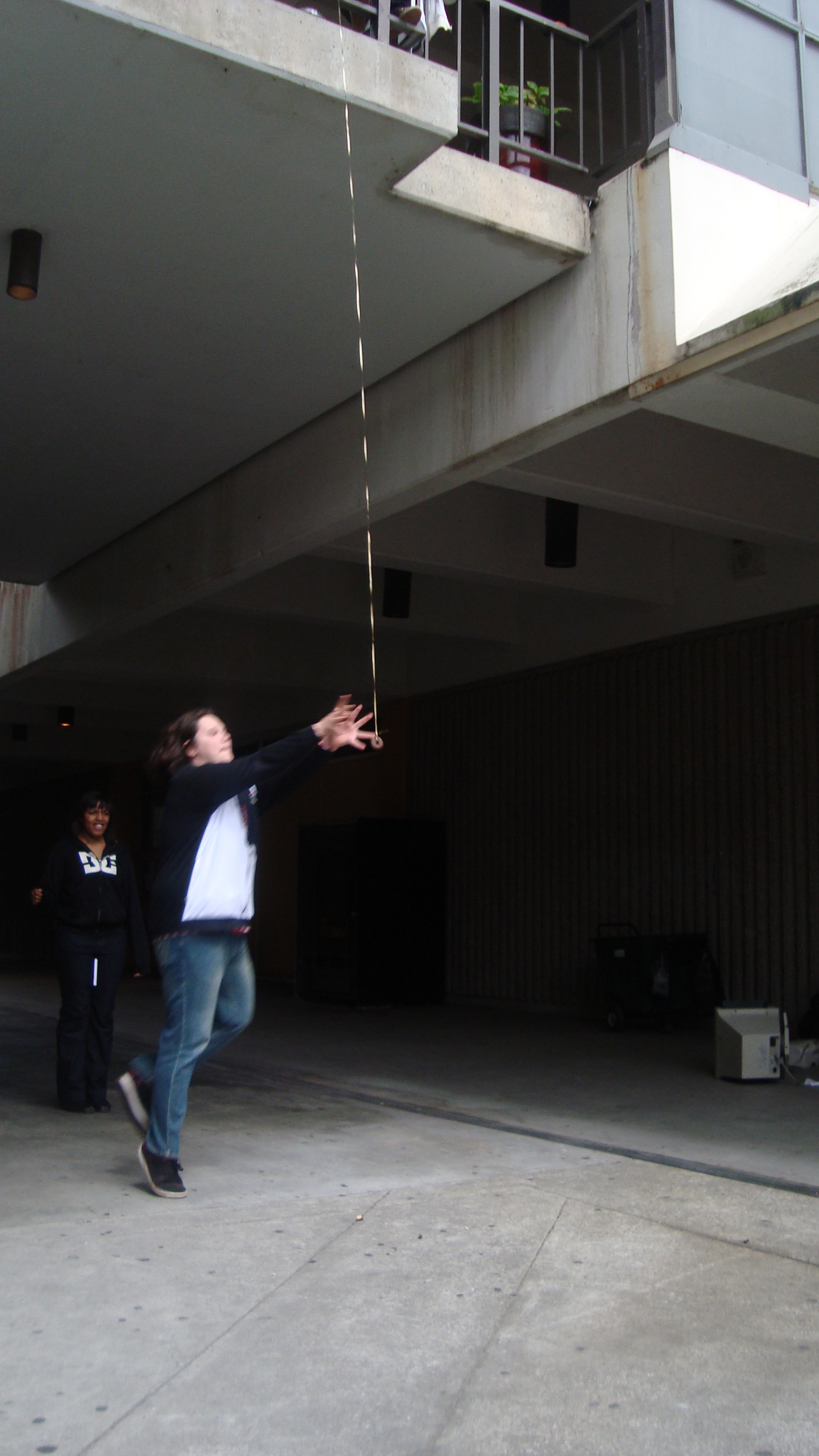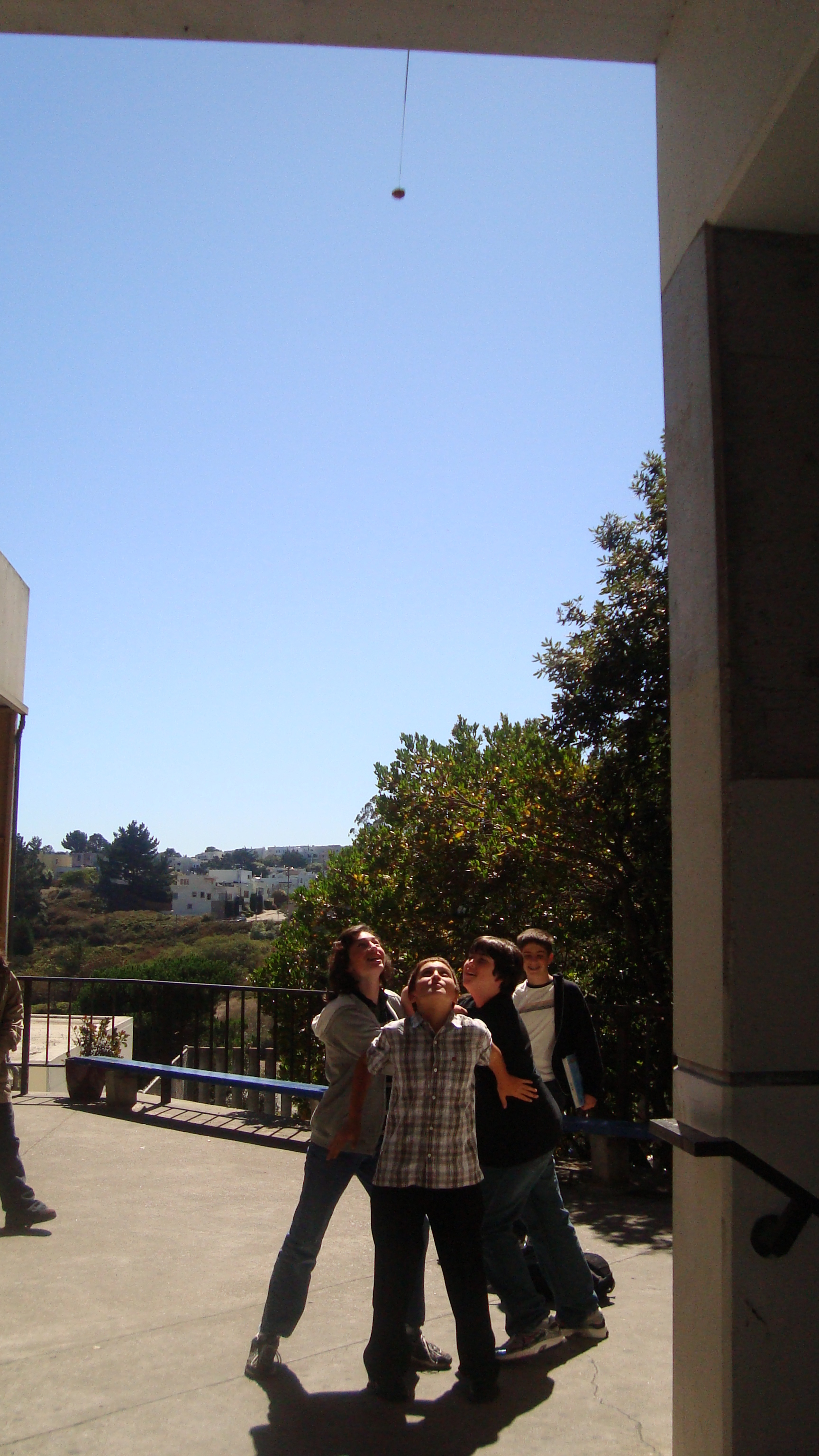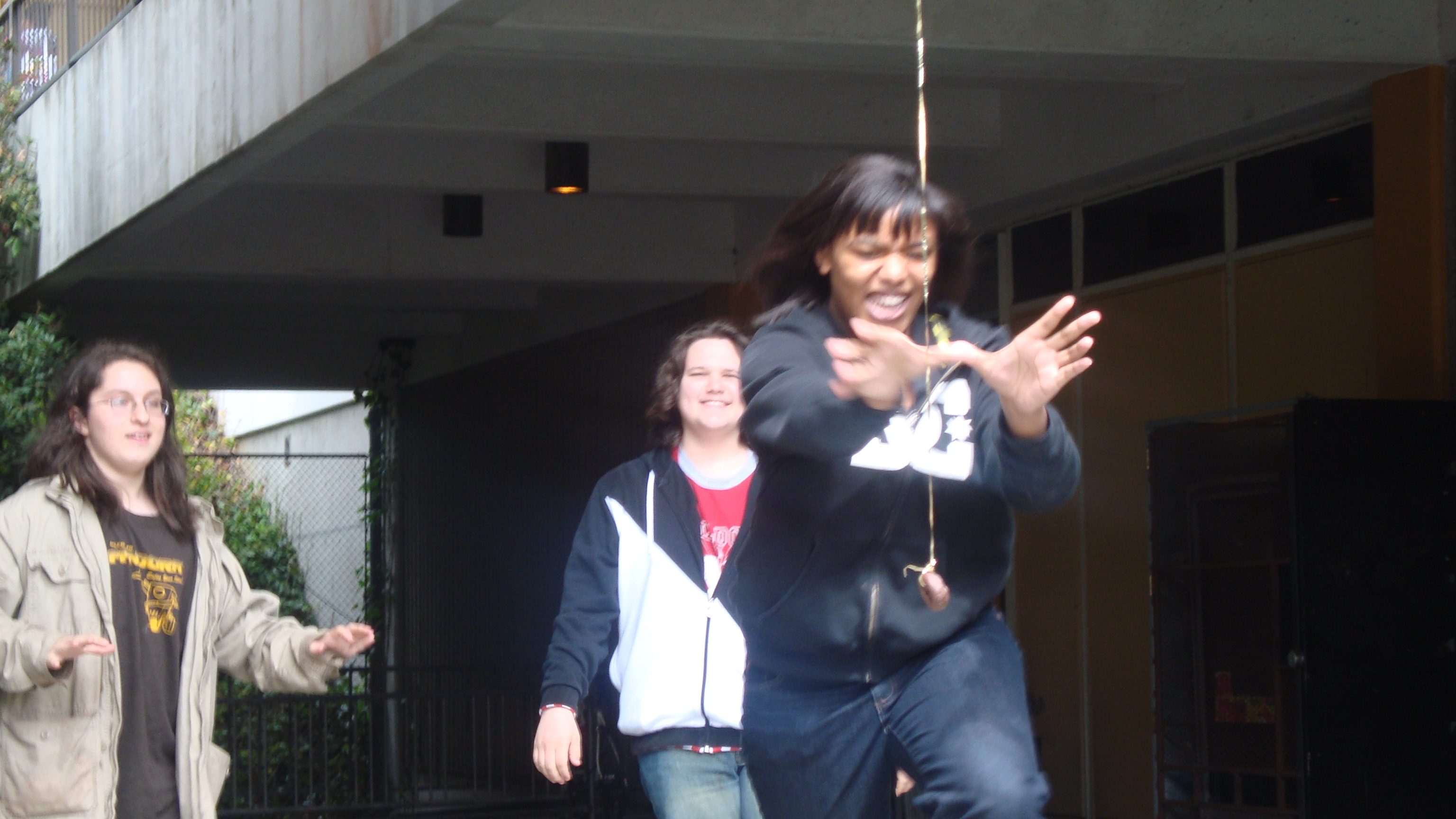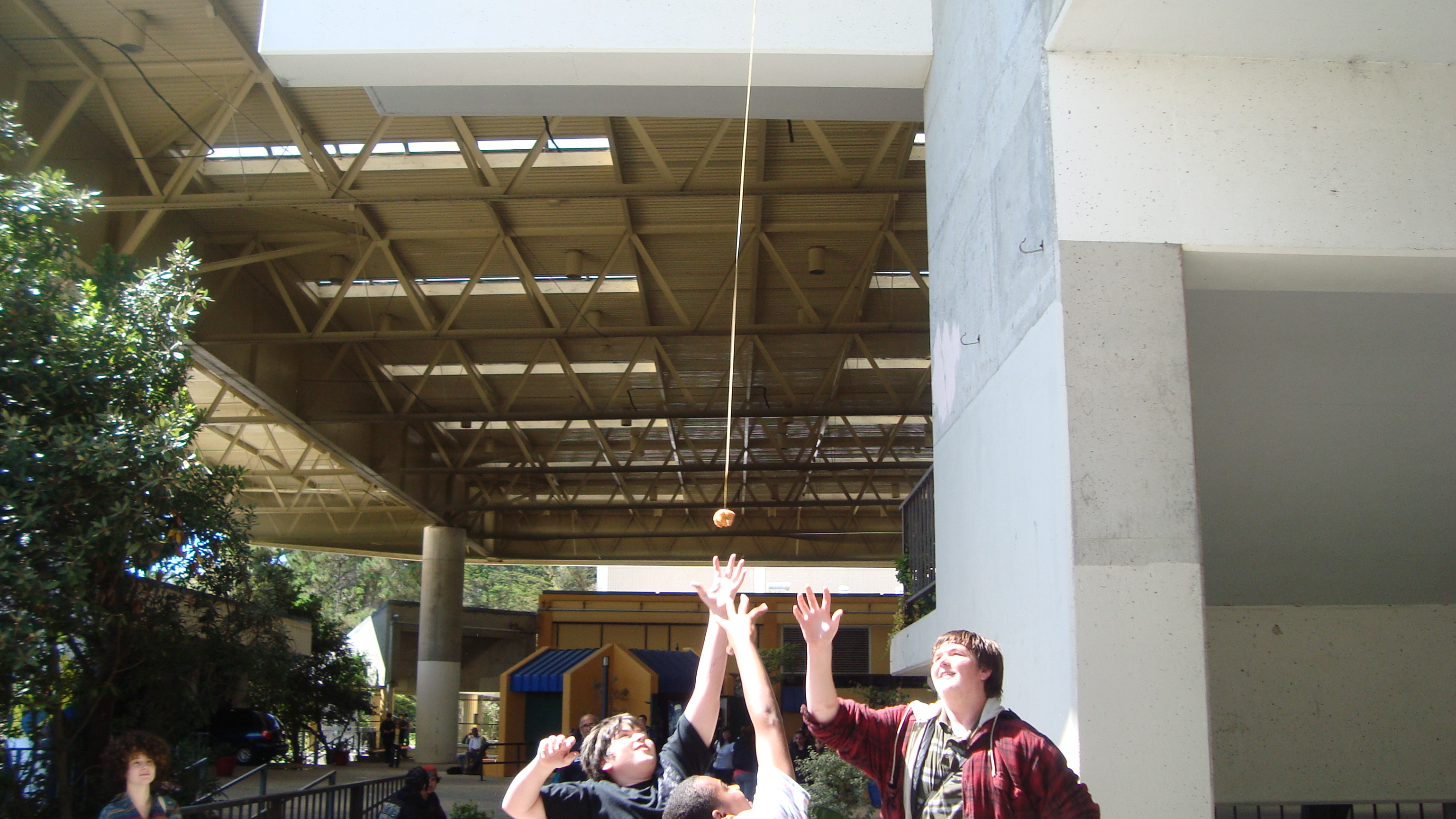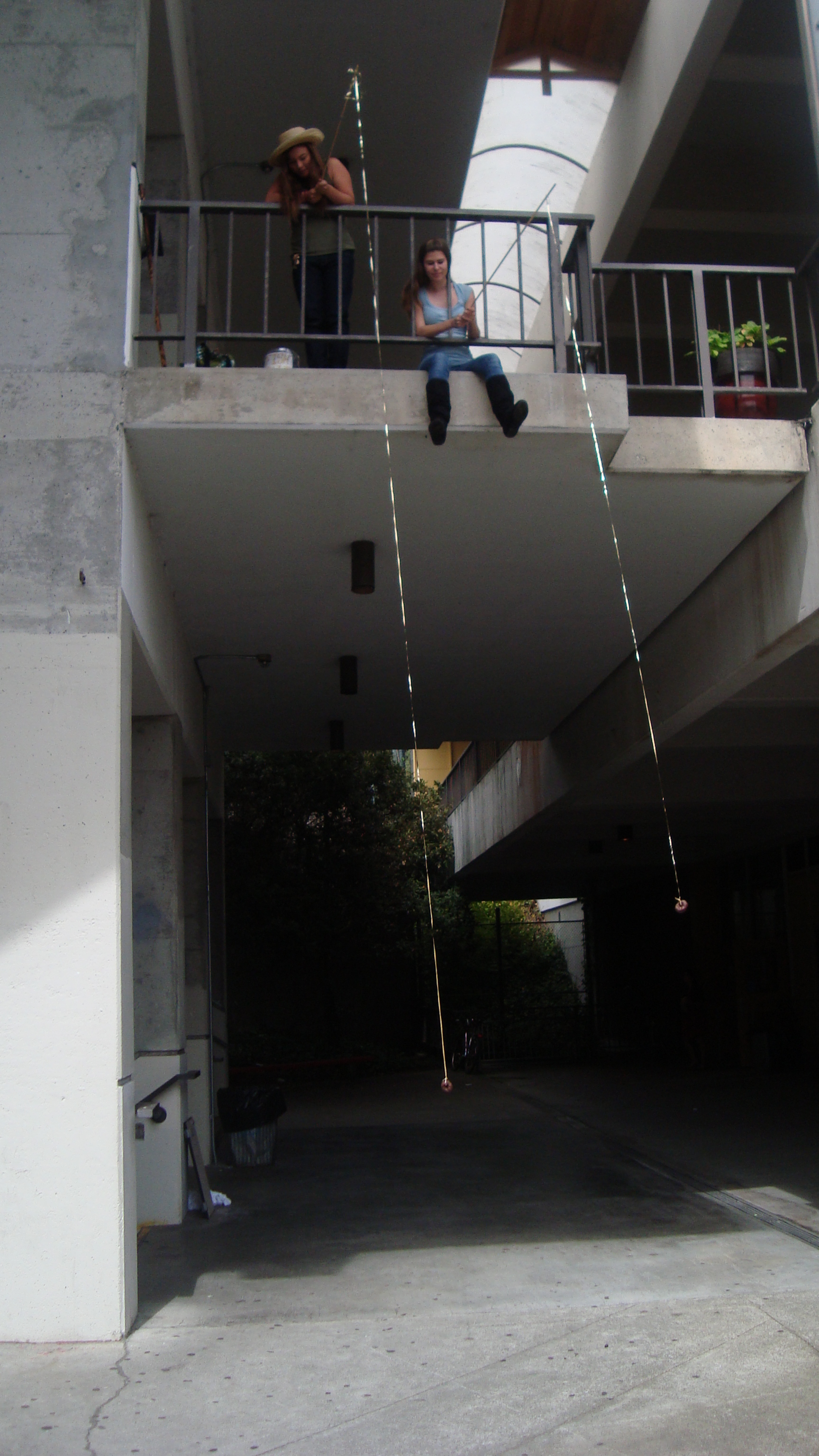 September 20th, 2009 9:30 PMWe first went to the dollar store and bought a package of five or six donuts, then bought a dowel from Cole Hardware to make a rod. Finally, we sat down at Yerba Buena and strung it up. The first girl came, a chubby little strawberry blonde in a pink outfit. She screamed: "I want it!" and took it. That was our first fish. We didn't get a photo of it, because Bryce ended up downstairs a little too late to take photos. After this, we were soon removed from the vicinity by the Yerba Buena Fuzz. We continued over a Bart station, but it was relatively unsuccessful. Finally, we decided that teenagers were the best fatties one could find. Teenagers eat anything, and they eat it with gusto, so we went fishing on monday and tuesday in the quad at SOTA. Initially, people didn't know what to make of it, but eventually it gained popularity and we had a crowd by tuesday. It was an incredibly impassioned event, and was colored by the many different characters...we had: