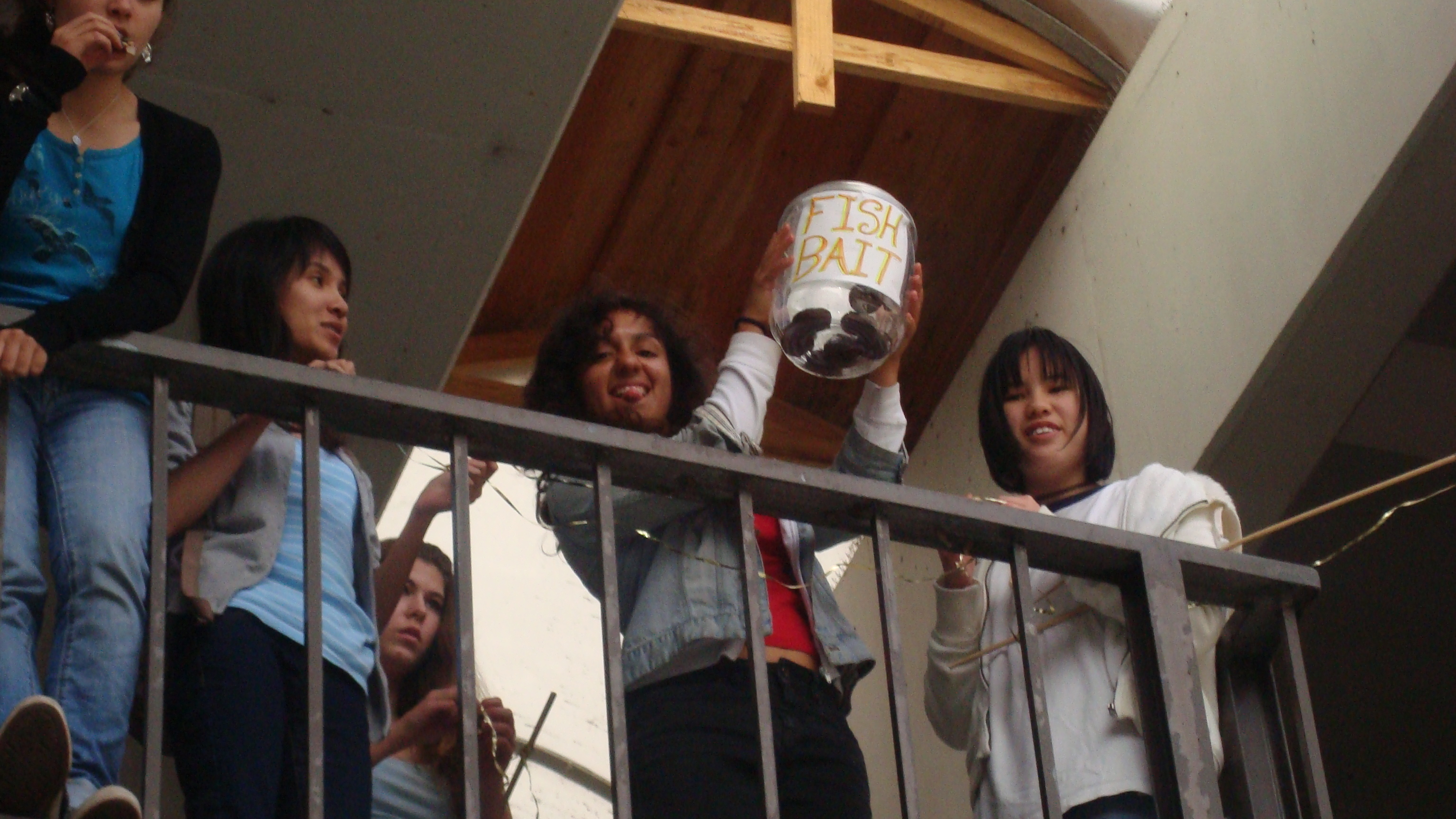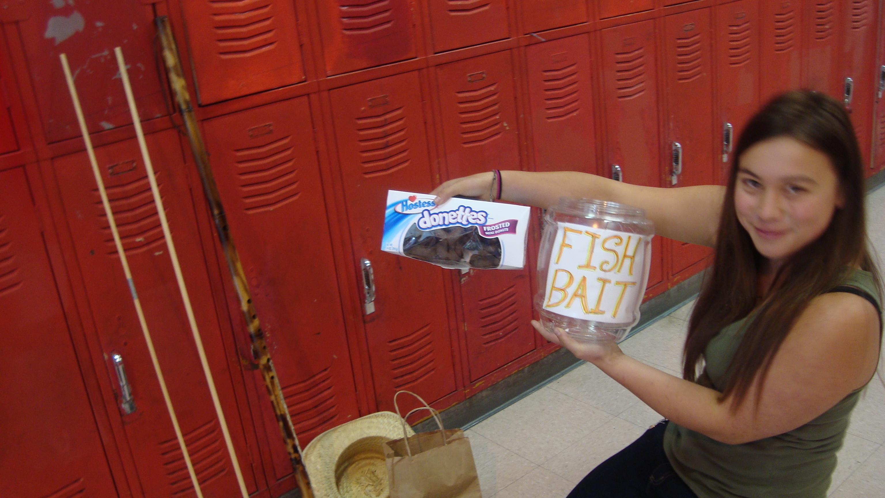 Karen most lovingly brought a bucket for our bait, and bought a pack of 24 donuts for three dollars. We decided that school, where there are many hungry individuals that have few qualms eating about bizzare food, we would have a much more successful fishing experience.