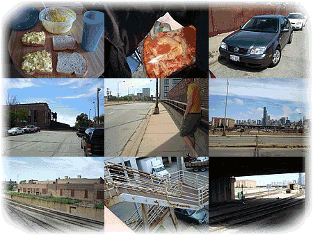 Wake Time: 6:00am Breakfast: Egg Salad Sandwiches Ending Time: 2:00pm (approx) Starting Area: 18th St. & Clark St., Chicago, IL Weather: Sunny & Warm Apparel: Improper Clothing & Footwear Lunch: Pizza Survivors: 2/2 (Note: Please watch video in proof files for full effect.) We've been in SF0 for a little while now, and we've always wanted to do the Dérive but never knew where or when. Well, it turned out that Kristin got the 3rd of July off, which she didn't know until she drove to her office to find the gates were closed, but regardless we had the day off and we decided to go to Chicago and do a Dérive, seeing as you all are probably sick of Schaumburg. The origin was Chinatown, and the destination was uncertain. Parking in Chinatown for longer than the 2 hours meters permit is fairly difficult, so we parked nearby enough to walk. Before we even parked, Kristin noticed an old bridge in the distance... Tall, dark & calling our name. ![]() And so we started. A short jaunt across an overpass revealed a very old staircase, potentially tetanus-inducing, but the quickest way down to the train tracks that led to the bridge. ![]() Now on the ground level, we understood that the stairs we had taken were not meant for pedestrian travel, as we suddenly found ourselves on private property. As we walked towards the bridge we considered our options. This was where we had intended to go and now that we had arrived and taken note of the security measures of the bridge, which included a no trespassing sign and cameras.. should we turn around? At this point Kristin turned to Steve and said "Are we going to cross this thing or what?" which required no response. ![]() A look to the right told us that a Metra train was travelling on a cross-track and probably would not be a threat to our mission. The bridge was treacherous, and dappled throughout with rust. We crossed successfully. The only incident having been a slip on Steve's part due to improper footwear (flip-flops, of course.) ![]() Once on the other side we were met with opposition. Surrounded by train tracks in every direction but one, with a freight train passing by and the remaining side housing a fence to keep us where we were. A decision had to be made. The other side of the fence seemed a friendly area, suitable for walking & exploring. Sweet, sweet Ping Tom Memorial Park. Not that we knew what it was before we jumped the fence. ![]() Under Steve's careful tutelage, Kristin was more than capable of hopping over the fence, skirt & all. From the other side she watched as Steve chose to make use of a nearby tree, mysteriously placed on the same side of the fence as the train tracks, almost intentionally... ![]() In any case, Ping Tom Park is awesome, you should check it out some time. After following the rivers edge around the park, we ran into a fence. Not literally, I just mean it was clearly blocking our path. On the other side we could see a mattress & so we decided.. there must be a way through. ![]() Traveling up the fence we noticed, on our right, a playground, currently attended by housewives & children. On our left there was a gate, with a very large gap between the doors and a sign that told us that we were entering what was formerly 'Ping Tom Dump' which was apparently an illegal dump cleaned up & closed by the city. Whilst wondering whether or not the housewives care enough to take action we went ahead and ducked through the gap in the fence before our chance was lost. ![]() We discovered a very colorful mysterious pile of rubble (which from far away looked like a very colorful mysterious pile of mattresses), a mysterious pile of branches, and a bridge covered in graffiti. We were attracted to the bridge and started heading towards it when suddenly our noses detected the smell of a small bonfire. Keeping in mind that the city's homeless population is out of control.. and that we were in an off limits area, we decided it would be safer to turn around and find an ulterior route. ![]() Over a hill and round a path we found more train tracks. Once again, we were far too close to them for this to be somewhere we were supposed to go. Much meandering and skylarking was disrupted by the spotting of a building that looked like it may contain train conductors, guards, dogs, etc. that we did not want to meet. So we turned the other way, which brought us very close to a parking lot for what looked like city construction vehicles. ![]() At this point a yellow truck drove by & the driver looked our way. His truck stopped. Kristin & Steve exchanged glances. Steve: "I think we should duck behind these trees" Kristin: (running) ![]() The drivers truck reversed and then moved forward again and after waiting approximately five minutes we moved along between some train tracks and a baseball field. After seeing the most lonely baseball ever, long ago abandoned after a foul ball went awry, we found a hole in the fence and decided to cease our trespassing. ![]() Now on the right side of the fence, things were less exciting but safer, both for our criminal record and our feet. My advice for future Dérive participants is this: wear good shoes. If you're going to really go for it, long pants are nice when walking through weeds. Skirts and shorts are not a good idea. Kristin was pulling little prickles off of the inside of her skirt through the remainder of the afternoon. ![]() We made our way back towards Chinatown, walking briefly on the same bridge that had the rusty staircase, then passing the "ritzy" areas and moving towards the center of tourism. Foot and vehicular traffic was dense, it was hot (sunburns ensued!), horns were honked and our feet were not pleased. ![]() After going through the commercial district, we spotted a unique looking structure inside the gates of an apartment complex. How could we not look into it further? So, in we went. We followed the path through and then out of the complex, ending up in residential area, which was pleasant an
