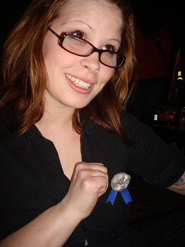 Kristin proudly displays her ribbon. We did not think we would make it this far without being tagged.