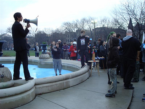 We parked our car next to Wicker Park after seeing a quite interesting collection of scavengers gathered around the fountain. Sign up, get your ribbon, read the rules... Dax speaks on his device and we're out. Steve Richey, Calyx and I formed a team as Myrna Minx had departed to work the second stop.