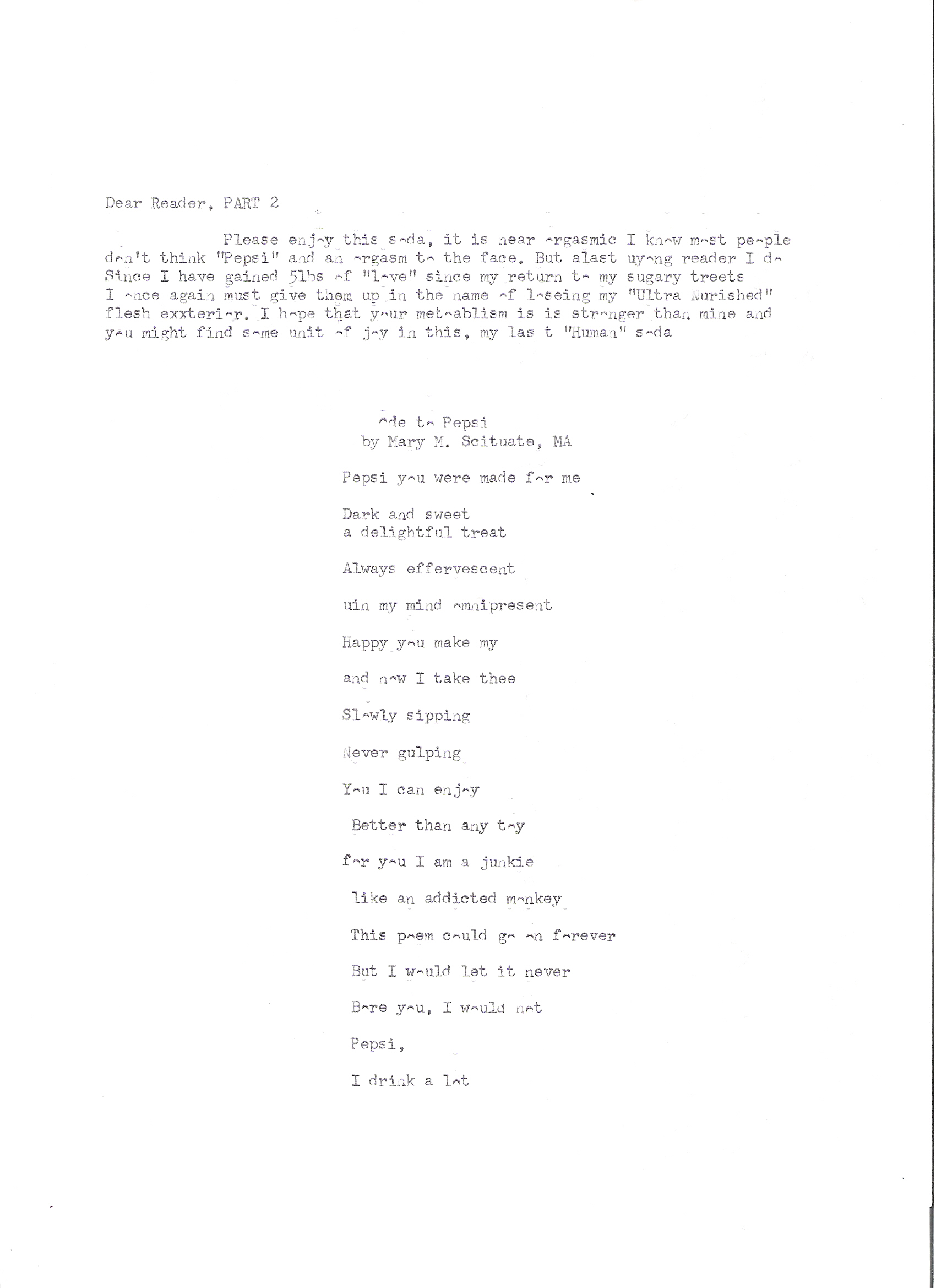 Ode To Pepsi Mary M., Scituate, MA Pepsi, oh how I love thee Pepsi, you were made for me Dark and sweet A delightful treat Always effervescent In my mind omnipresent Happy you make my And now I take thee Slowly sipping Never gulping You I can enjoy Better than any toy For you, I am a junkie Like an addicted monkey This poem could go on forever But I would let it never Bore you, I would not Pepsi, I drink a lot
