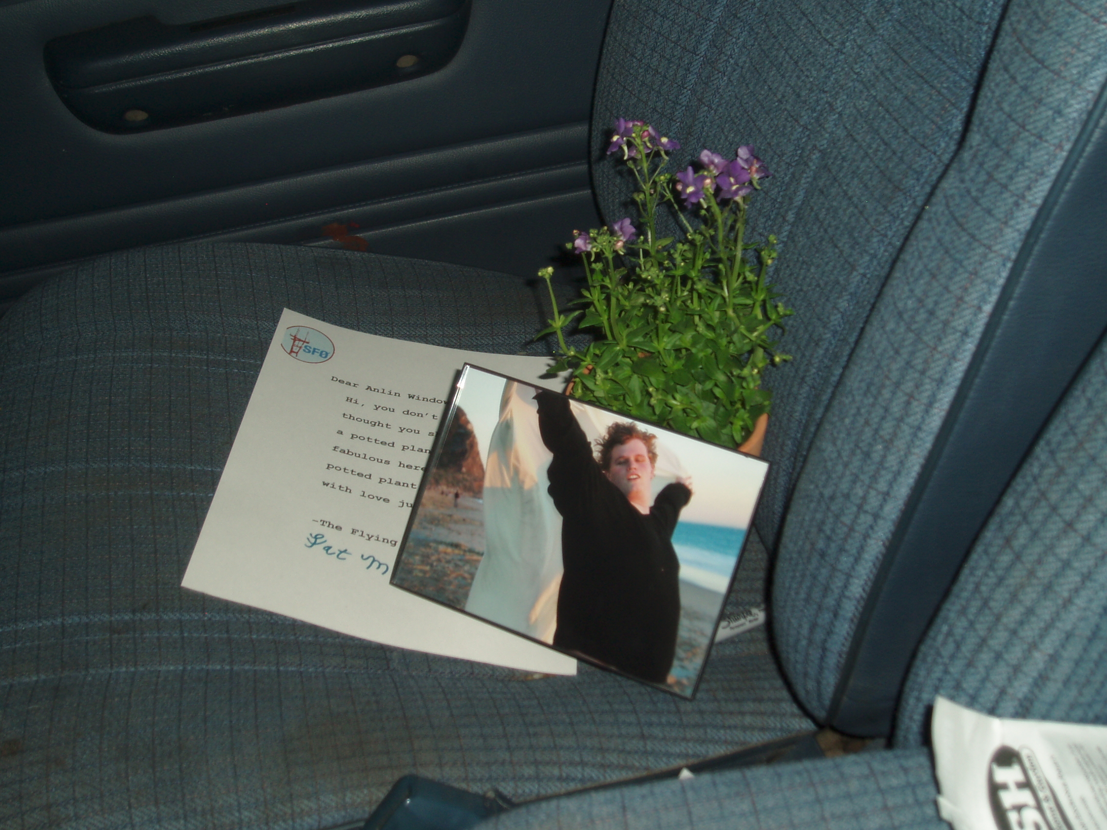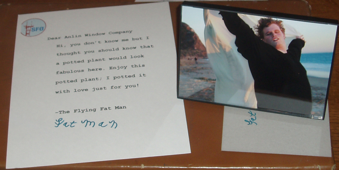 Dear Anlin Window Company Hi, you don't know me but I thought you should know that a potted plant would look fabulous here. Enjoy this potted plant'; I potted it with love just for you -The Flying Fat Man