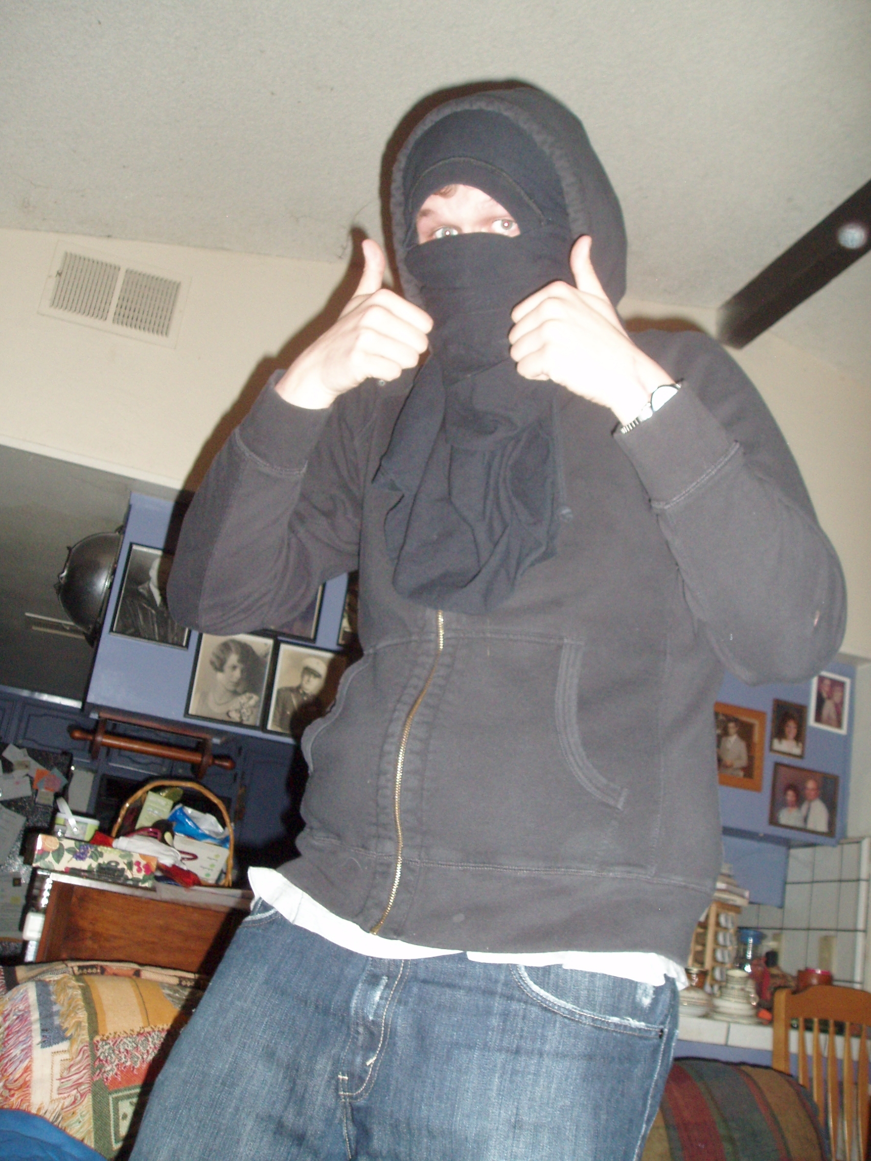 2328 hours. Cop just drove past....saw nothing wrong with a man in a ninja mask in a black jacket walking the streets of Clovis after hours....I got lucky I look really out of place with this mask on.