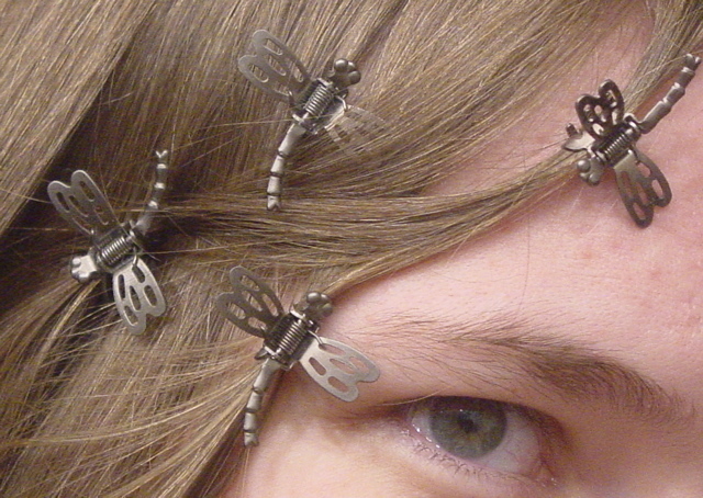 I recently came into possession of a set of dragonfly hairclips. My adventures will probably be solo, and I have no desire to photograph myself doing them. I can, however, allow my flight of dragonflies to accompany me and be photographed in my stead, should the need arise. Thus, they should be in the player photograph. And in deference to the me/not-me relationship between myself and my character, the photo should be *of* me without actually *showing* me.
