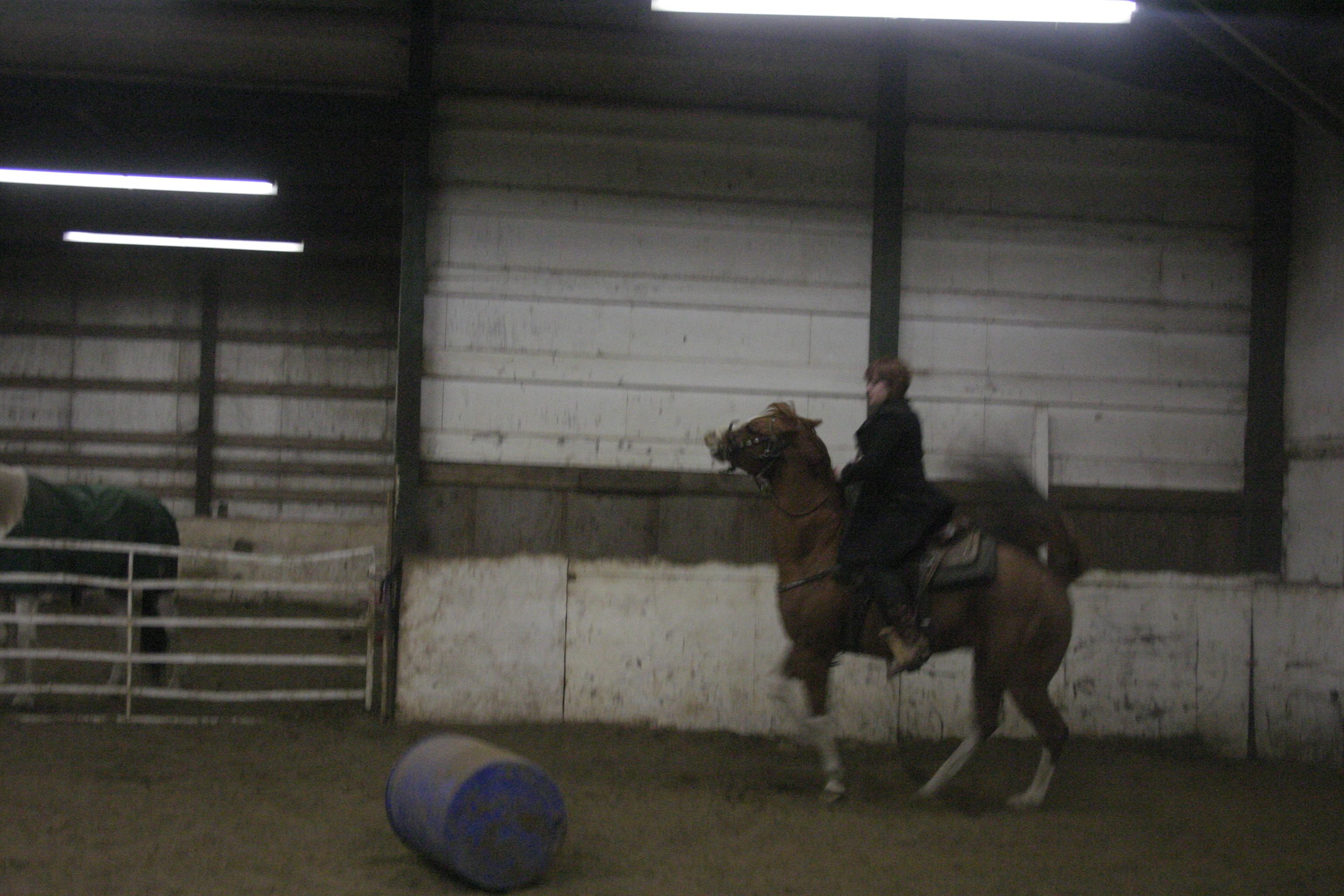 To conserve scale, every day I do something more difficult with him, like starting out with just a walk around the arena, and eventually progressing to things like trail courses.. When I push him too far, like asking him to do something he doesn't quite understand or is scared of, he gets upset and bucks (see photo).