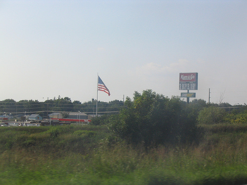 Documentation photos that made it for this proof: a wind farm, hay bales, a casino sign, the vulgar convenience store name (Kum & Go), an RV, and a bonus flag in the convenience store shot that I didn't count since I used a flag by McDonald's in Story City IA. I saw an oversize load on a truck but didn't count it because it was before I started, and I didn't count the signs for the free wifi at Iowa rest areas b/c I never managed to snap a view of them, much less use the wifi.