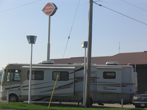 My notes and most of my documentation are scribbled on the bingo square. The winning squares: RV; someone on the shoulder [@ about 103 mi marker someone w/ a trailer platform; @ 89.8 mi marker, a woman getting something out of the trunk of her red sedan--and no, we didn't stop to help either of them]; free space; road kill [approx 70 mi marker, something smaller than a deer but not sure what--a big raccoon?; then at 36 mi marker, definitely a raccoon]; and a state line marker, the bad camphone pic of the Missouri sign.