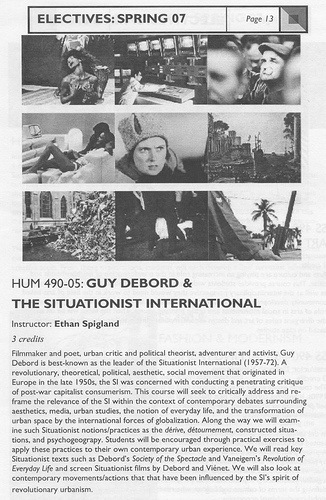 Part of the description: "...we will examine such Situationist notions/practices as the derive, detournement, constructed situations, and psychogeography. Students will be encouraged through practical exercises to apply these practices to their own contemporary urban experience."