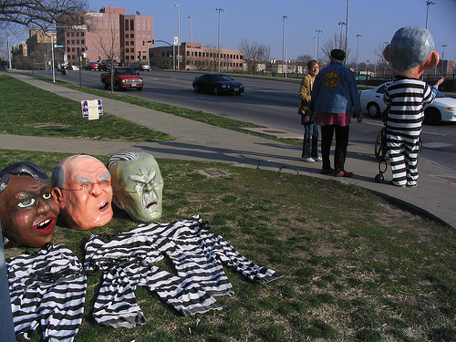 This is toward the end of a regular Sunday afternoon protest that's been held for years. The person in costume facing the traffic has a George W Bush head on.
