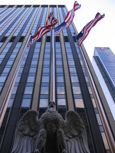 One of the eagle sculptures from the old Penn Station sits outside the current complex