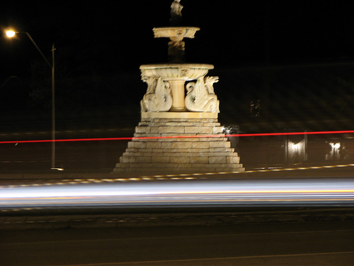 Usually this fountain in the middle of the parkway's traffic circle is on at night and is really pretty, but tonight for some reason it wasn't going (but cars were, as usual).