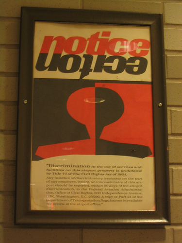 Any instance of discriminatory treatment on the part of any employee, tenant, or concessionaire of this airport should be reported, within 90 days of the alleged discrimination, to the Federal Aviation Administration, Office of Civil Rights, 800 Independence Avenue, S.W., Washington D.C. 20590. A copy of Part 21 of the Department of Transportation Regulations is available for review at the airport office."