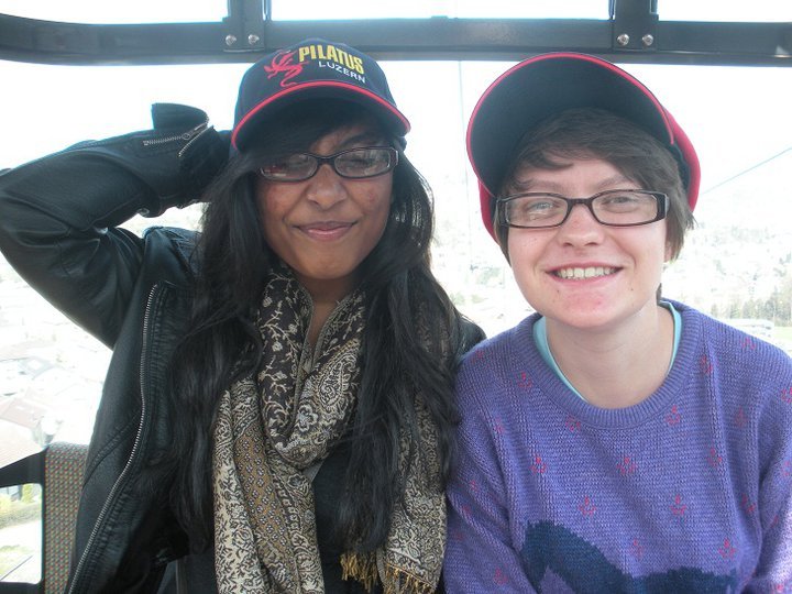Here is Nazara and me inside the gondola wearing our silly free Pilatus hats that were given to us by the gondola company