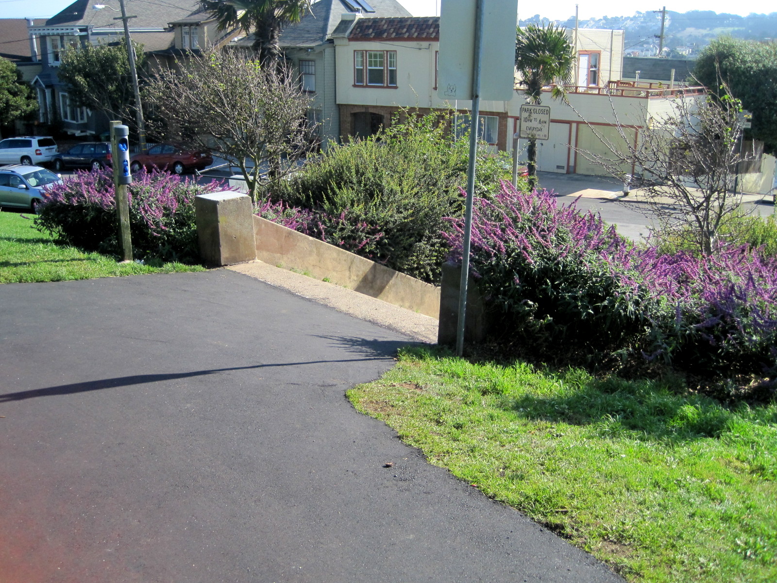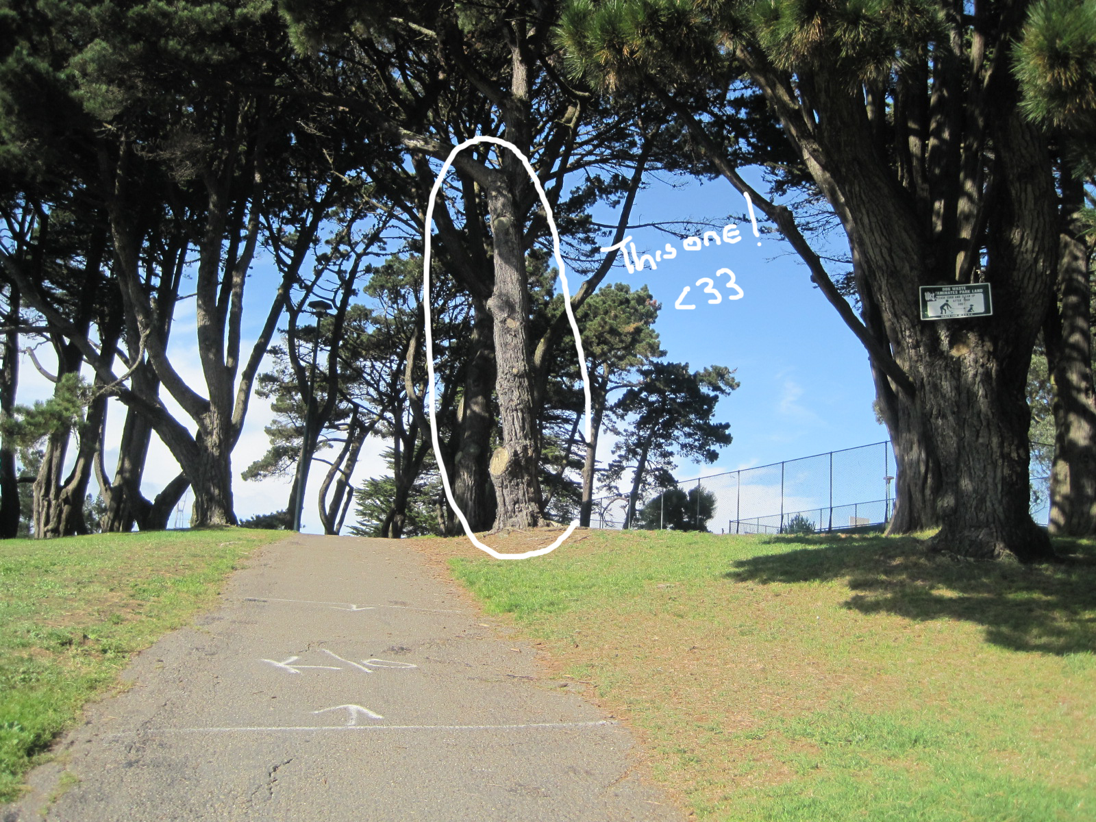 Instructions begin from the Murray St. Entrance. Stand with your back to the street, facing the park. There will be a 3-way forked path. Take the left fork (towards the courts, away from the playground). >>