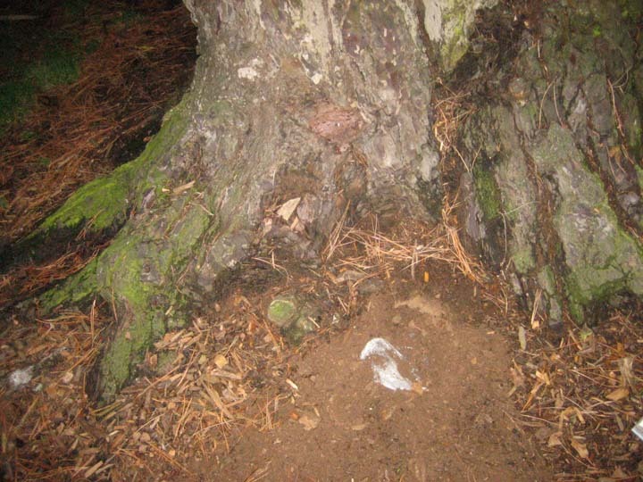Here is a closeup of the base, with the area of the buried package clearly marked. The umbrella will be gone by now.