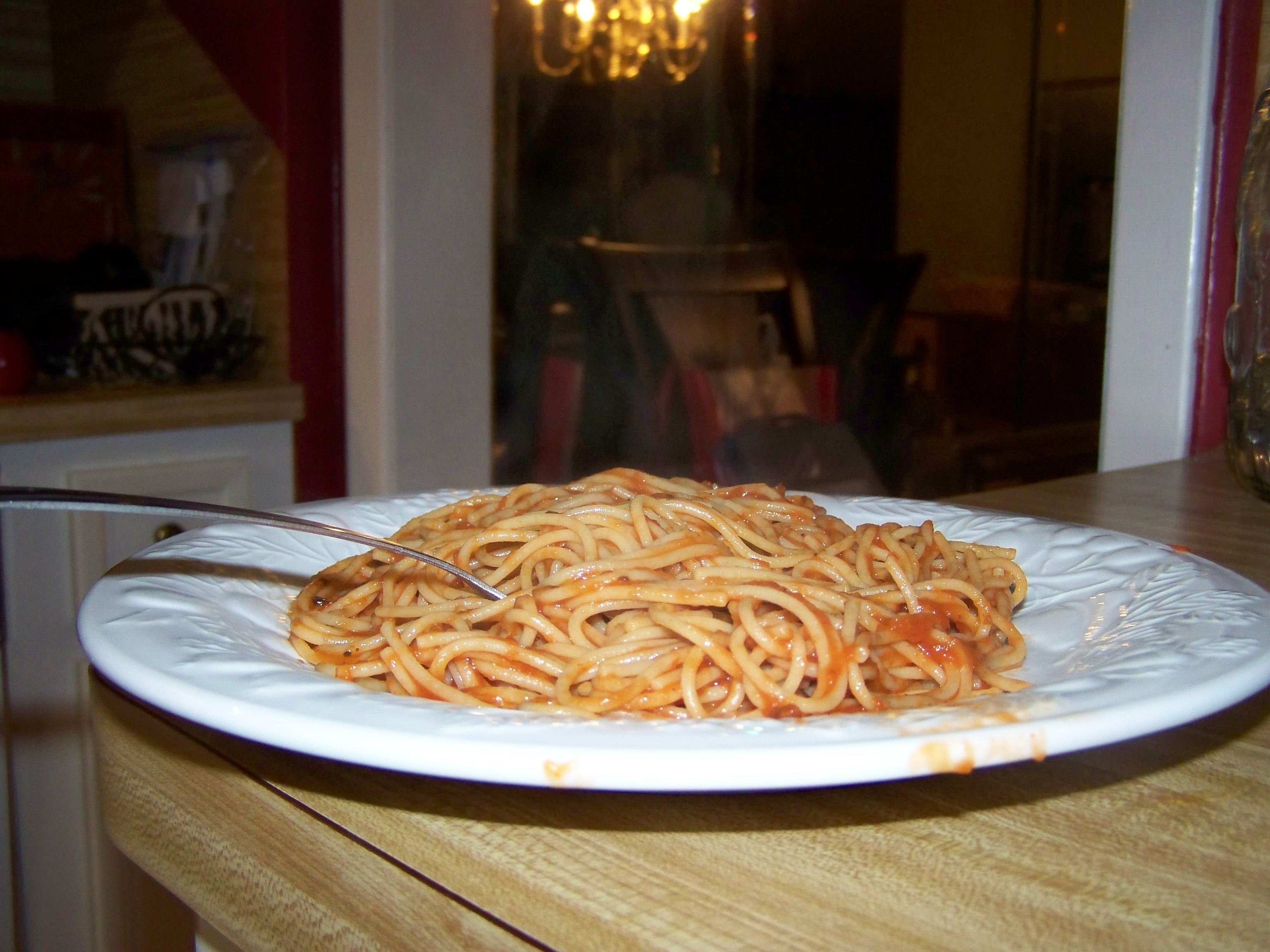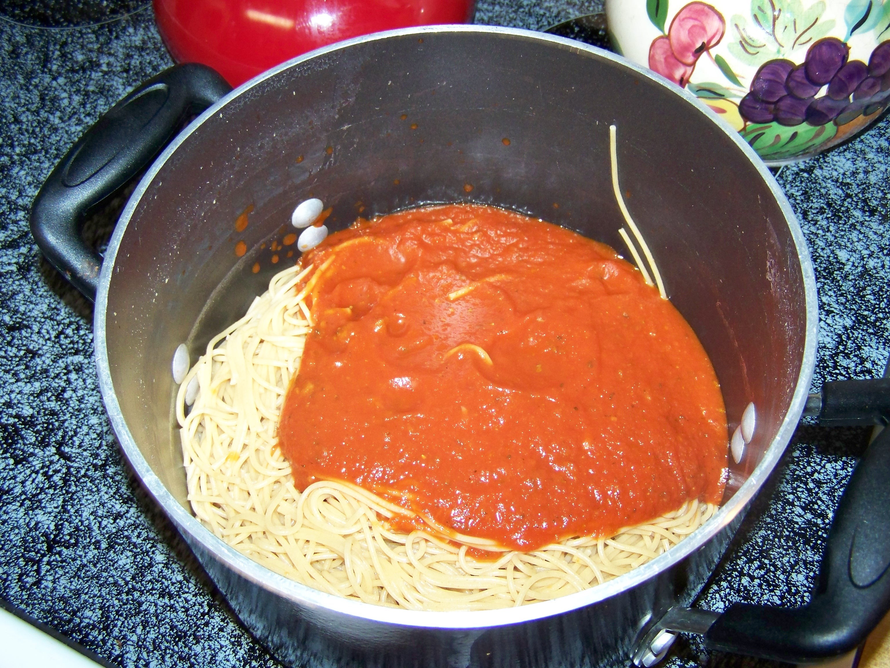 6. Once spaghetti is limp drain it and place it back in the large pot, then add the sauce, stir, and serve.