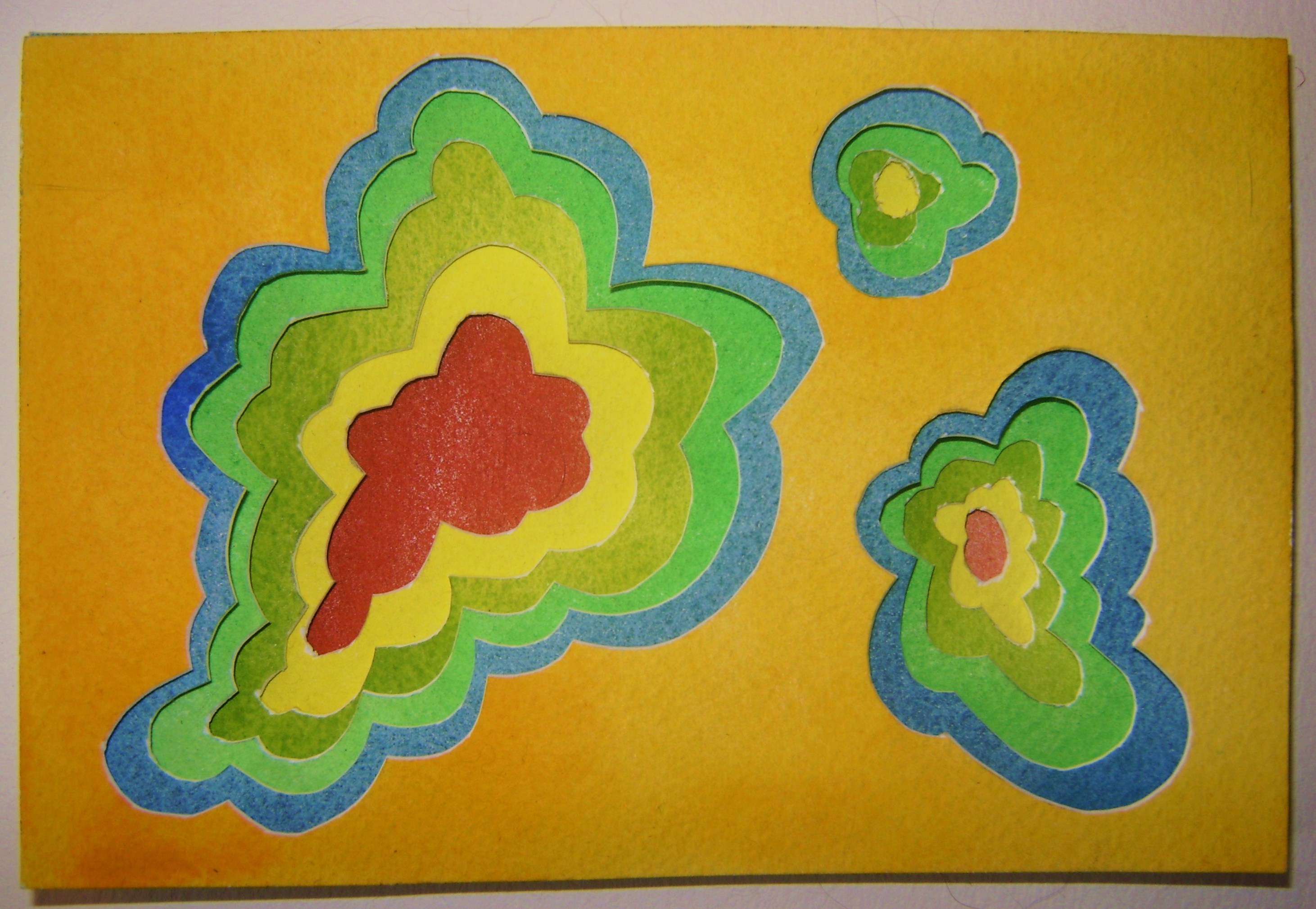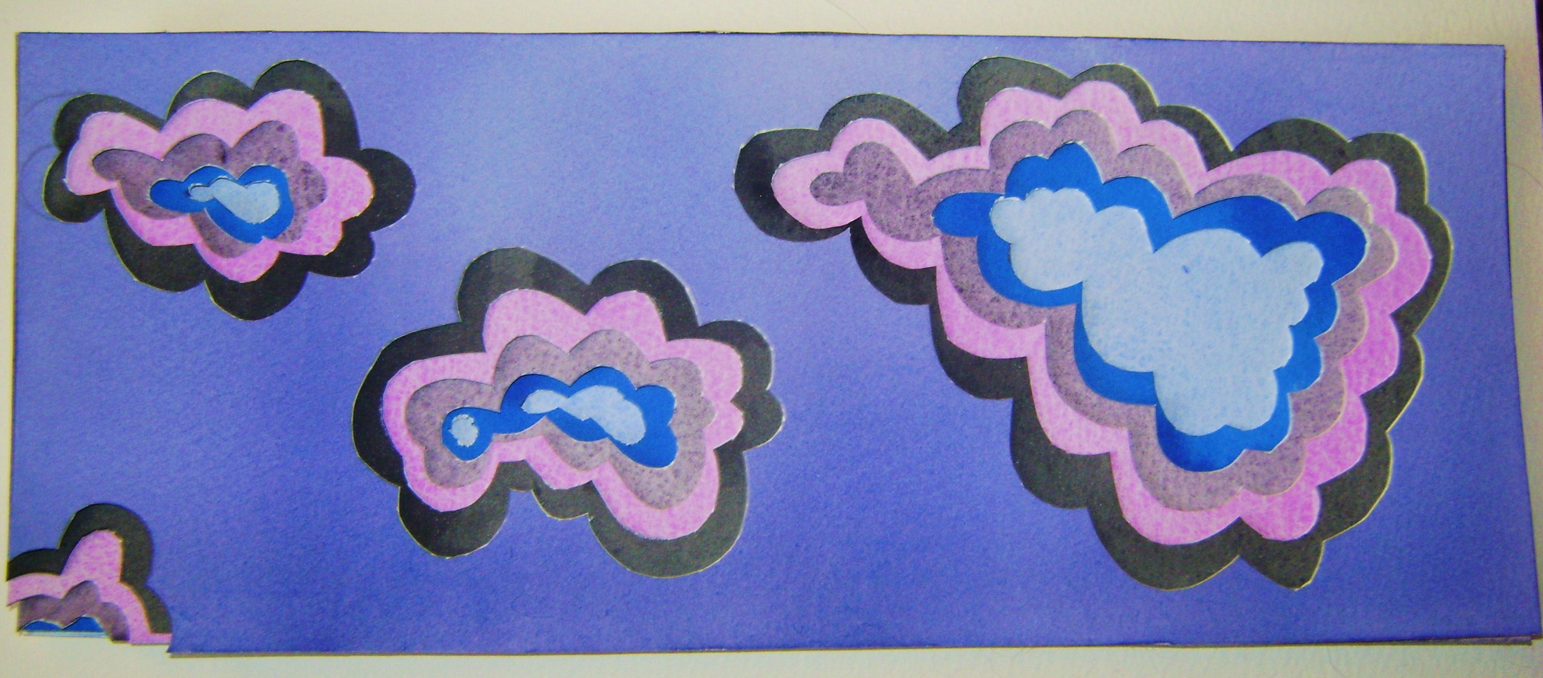 So, I decided to recreate these beautiful formations in exaggerated colors on watercolor cutouts layered over each other. But, instead of making them protrude, I decided to make them recede into the paper, like negative formations. I figured this would only be fitting since, like a memory, I will most likely never see them again.