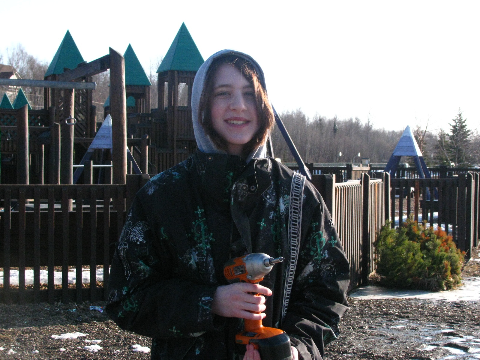 Goddess: OH MY GOD!! THAT WAS SO SCARY!! They put me on Jon's shoulders, then he climbed up on a picnic table. >.<# I'm deathly scared of falling from high places. I felt so unstable up there. And I couldn't get the screw to go in. So we decided to try on one of the wall beam things. I huddled away from human contact for fear they would traumatize me more.