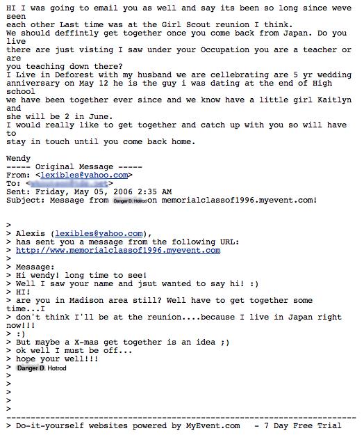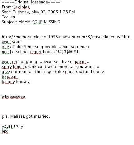 here's one more letter i sent via the reunion site when I was really drunk one night...I got a nice long responce back, which i wont post, but basicaly jen is also sad she wont be able to go to the reunion to see who got fat, but she has to get her PHD that weekend...we actauly correspond like once a year...so we havent totaly lost touch. :)