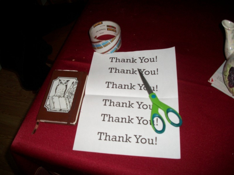 I grabbed my sheet of thank you's, my clear packing tape, and some scissors.