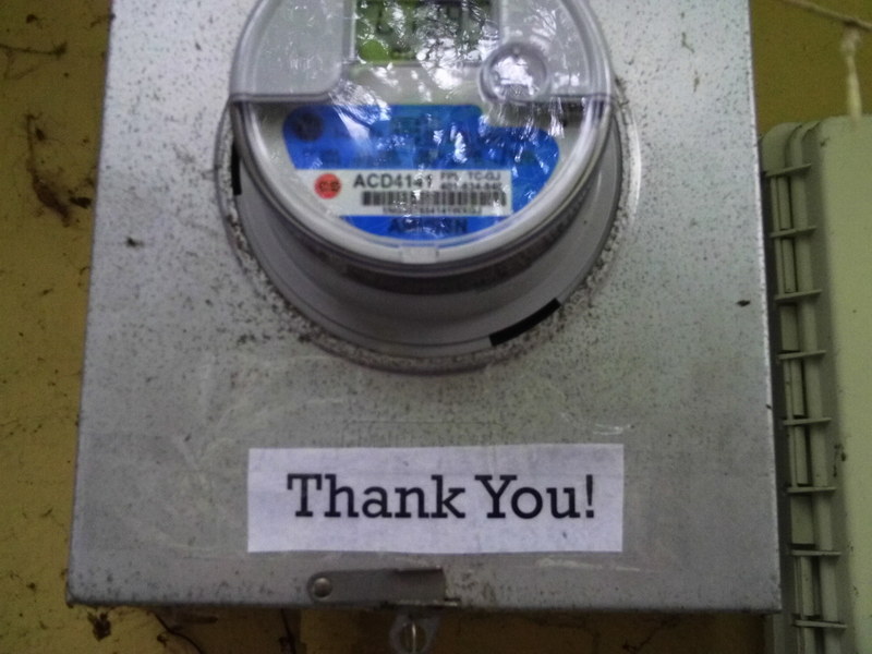 Final stop: Electric meter. I placed my thank you right below the meter. Probably only the meter reader will see this one, as our meter is hiding in an odd corner of the yard where I only venture to clean the lint trap. But I hoped it will bring a smile to our meter person's day.